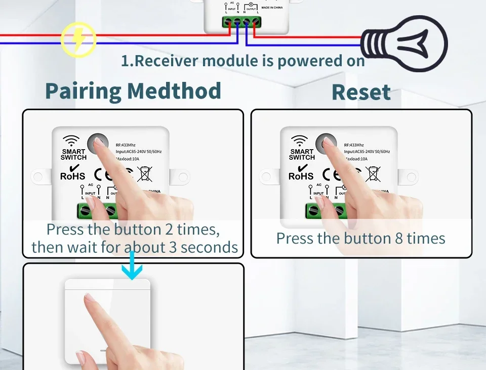 Only one step :Press the learning button(on the Receiver) 8 times. Wait for 3 seconds;