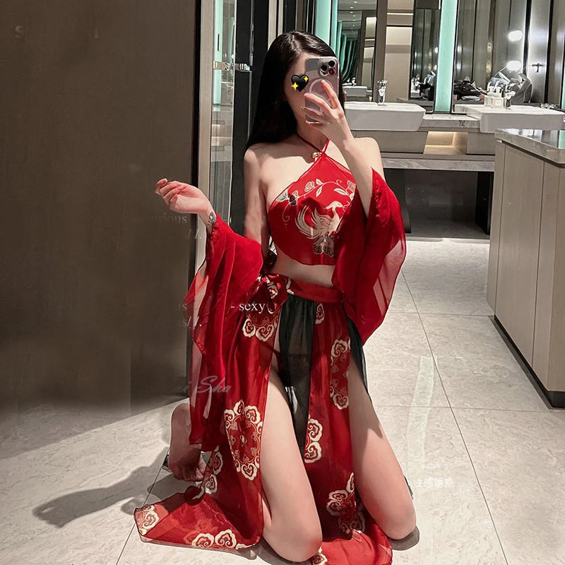 Women Chinese Traditional Dress Hanfu Chiffon Pajamas Robe Apron Suit Sexy Erotic Lingerie Vintage Clothing Female Nightdress
