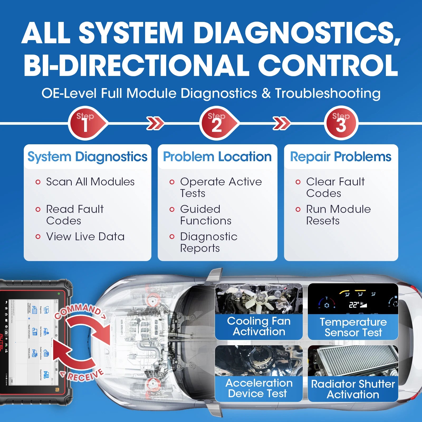 MP900-TS bi-directional scan tool features 3000+ active tests that can narrow the diagnostic range to quickly pinpoint problems. Without too much repair time, this Autel scanner avoids disassembling unneeded parts from your vehicles but also saves time spent navigating complex issues. Updated bi-directional control even extends to more modules & actuators, such as: