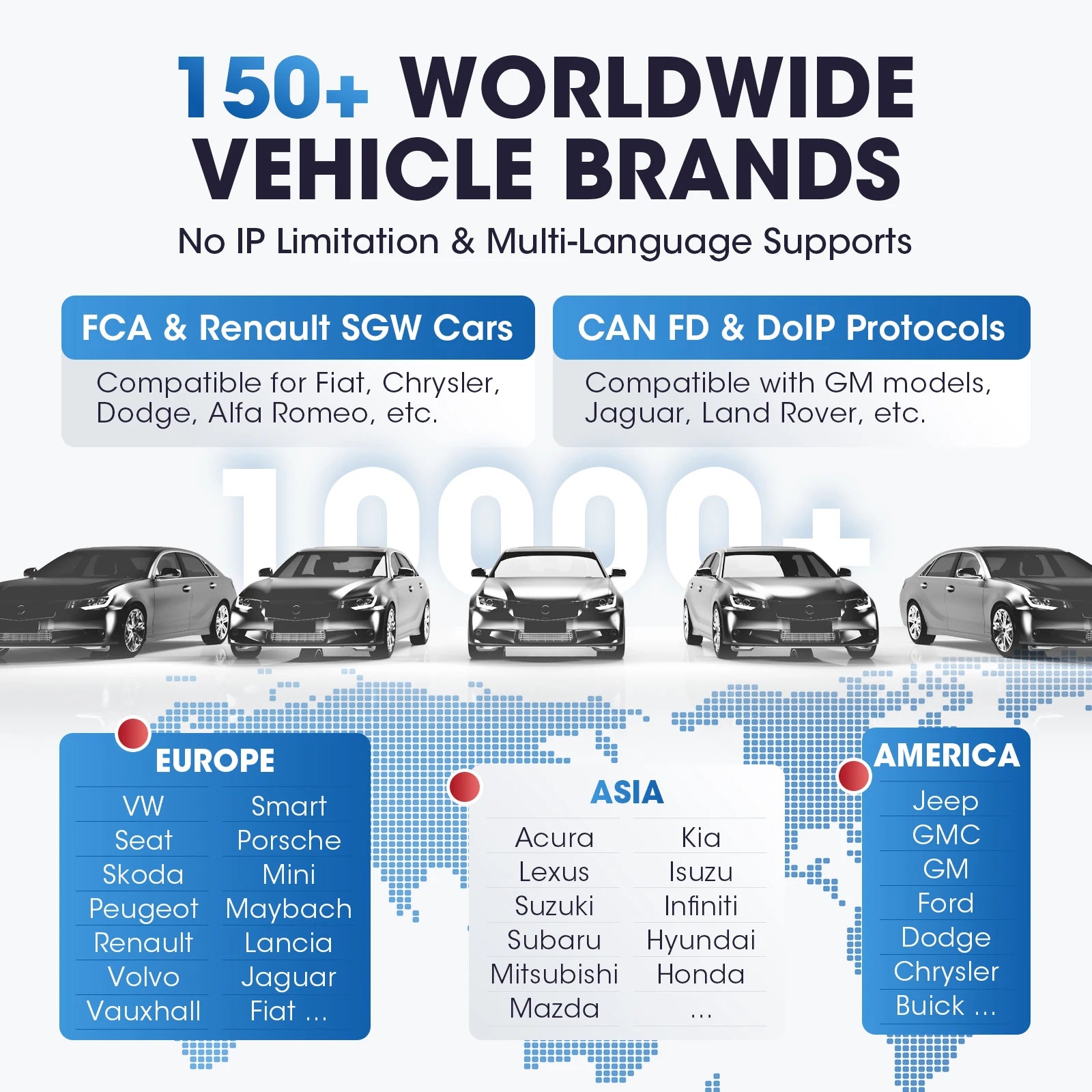 1996-2024 Worldwide Cars: MP900-TS holds 99% of vehicle supports that covers 150+ brands and US top-selling cars such as VW, Seat, Skoda, Peugeot, Citroen, Renault, Ford, Lincoln, Chrysler, Dodge, GM, Cadillac, Buick, GMC, Acura, Lexus, Volvo, etc.