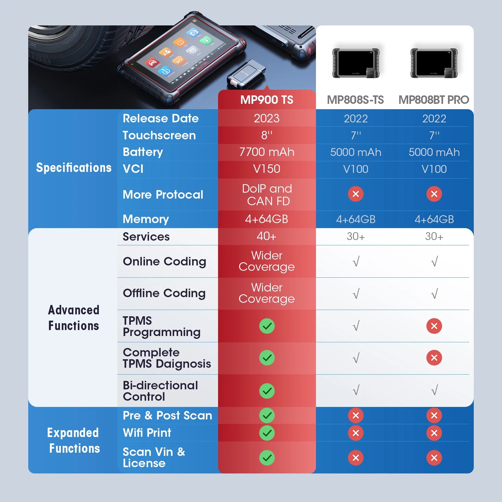 Autel MP900-TS car diagnostic scanner offers a cost-effective value for your budget! Then you can get the same 40+ repair functions and equal-level diagnostic capacity as MaxiSys Ultra of 4349 bucks but only spend 1269 bucks.