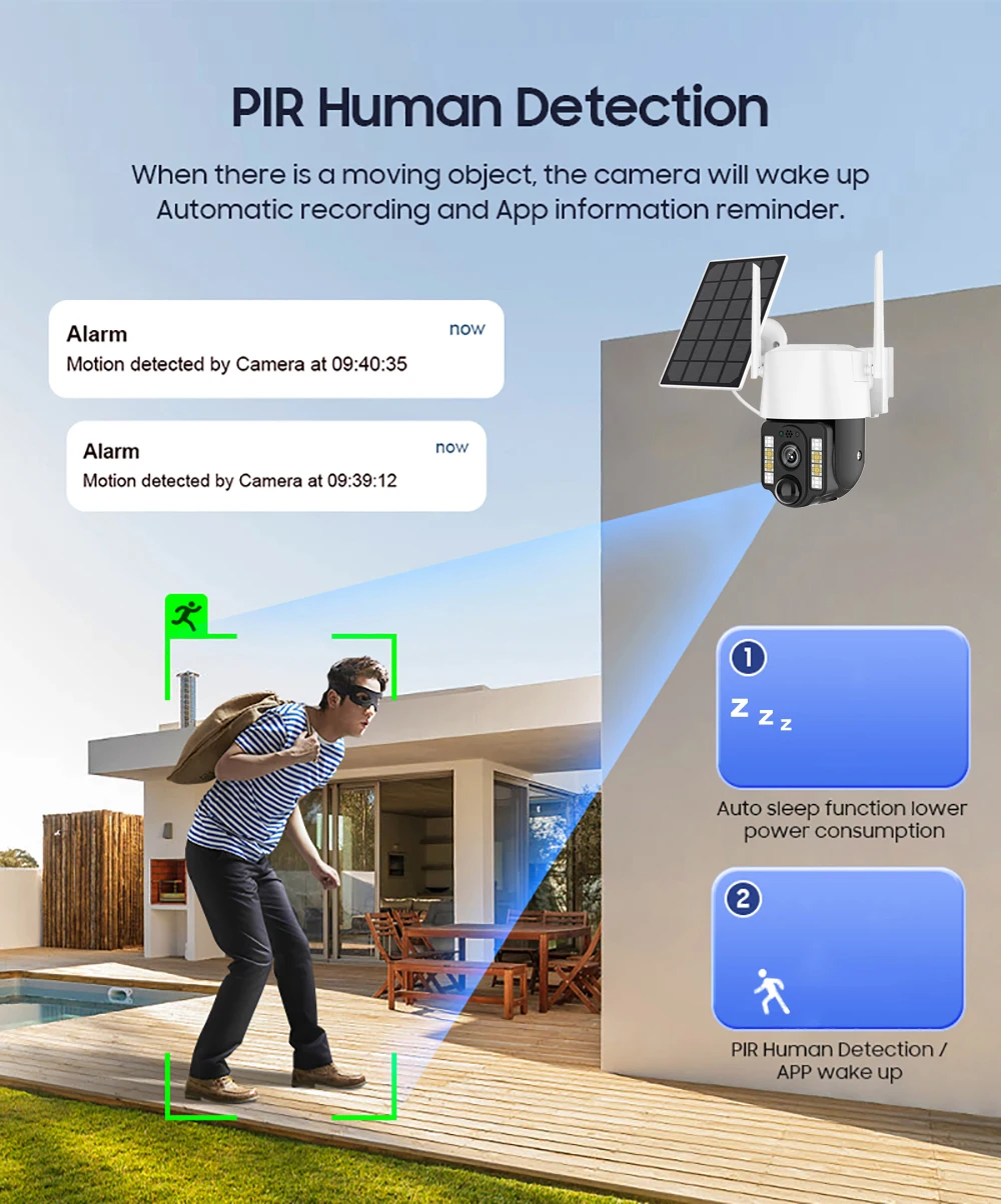 Automatically wake up and push alert message to your smartphone when someone moving in the area.
