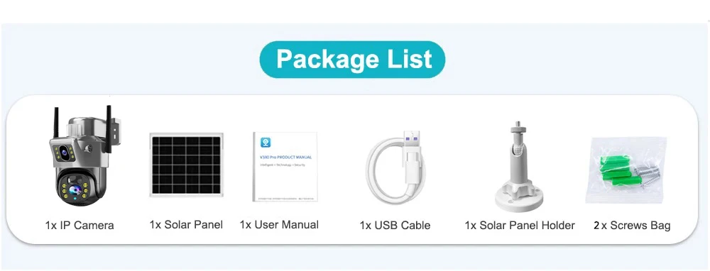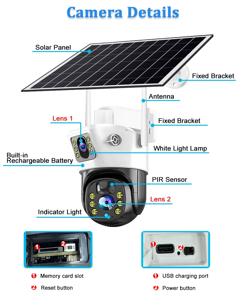 Built in 18650 Rechargeable Battery. Besides, the solar panel can provide non-stop solar power for the outdoor camera day or night, sunny or rainy. With rechargeable battery, it allows you no need any annoying wires for the PTZ outdoor camera 100% wire-free.