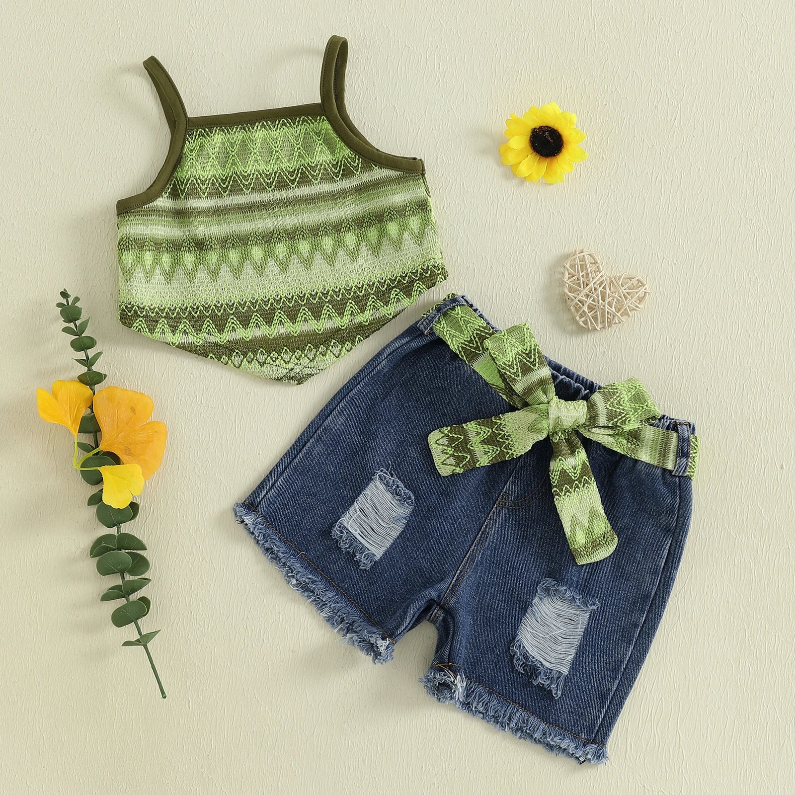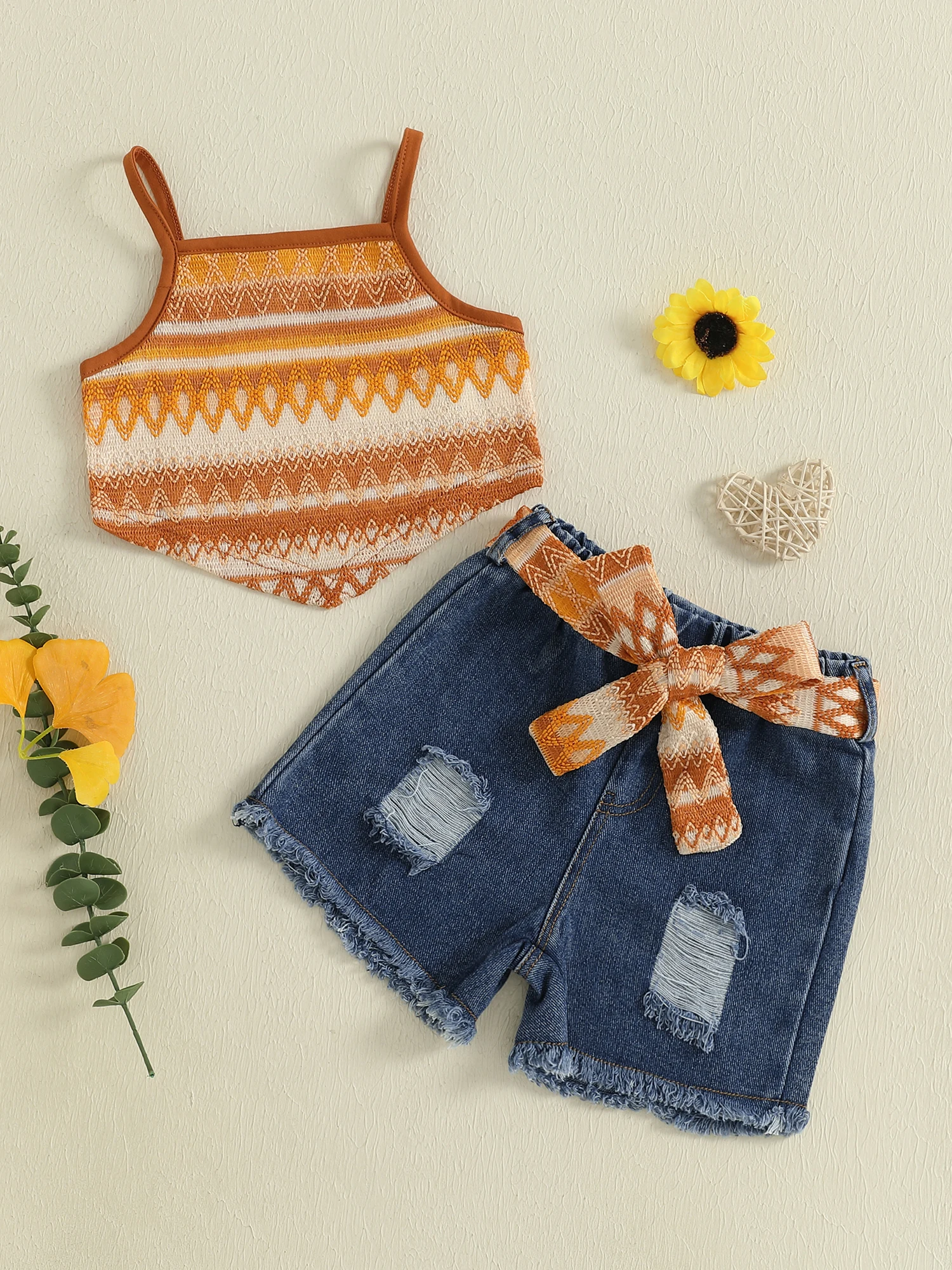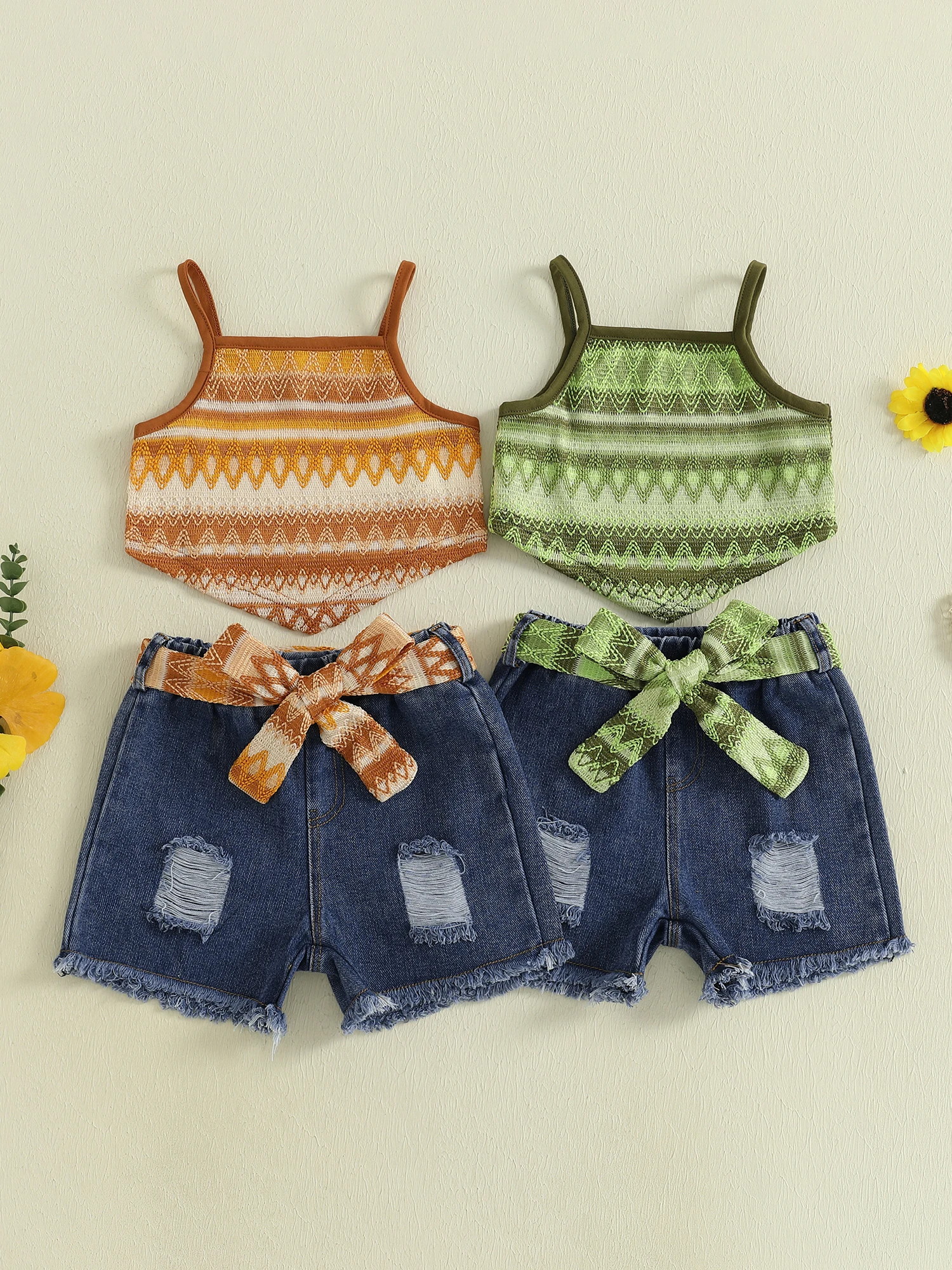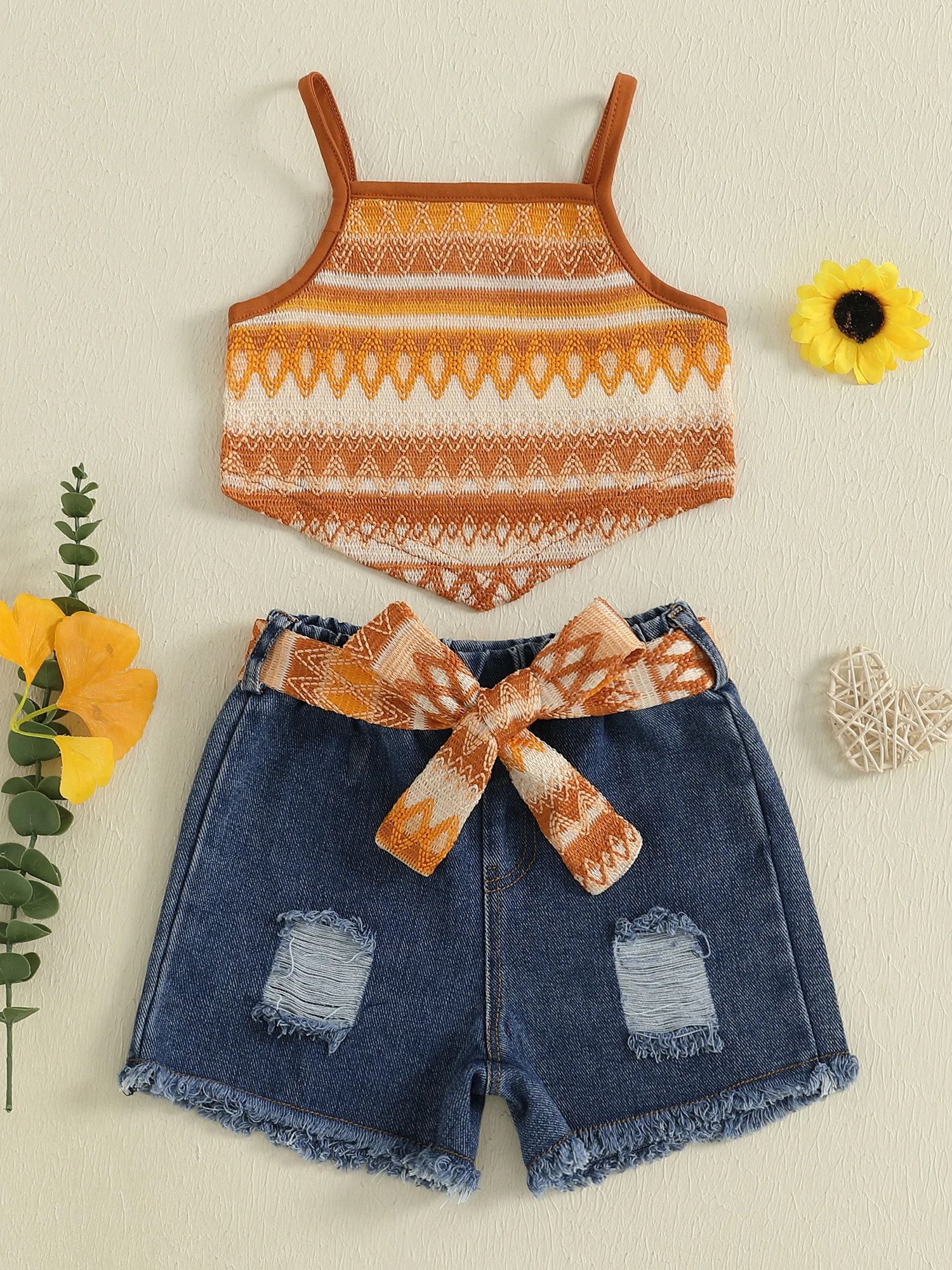 2-7Y Kids Girls Summer Outfits Adorable Boho Print Camisole Tops and Ripped Denim Shorts with Belt Set Fashion Children Clothes