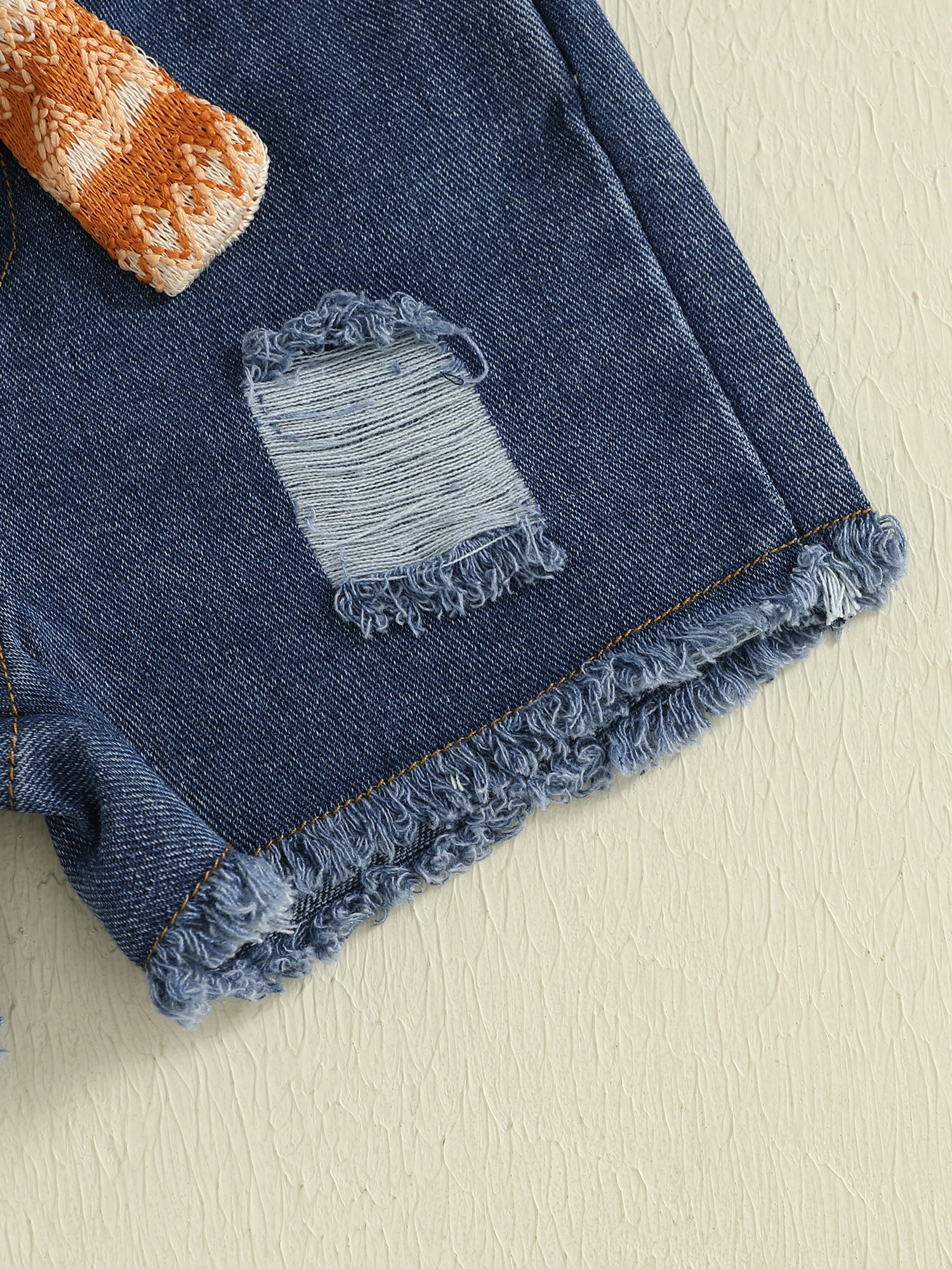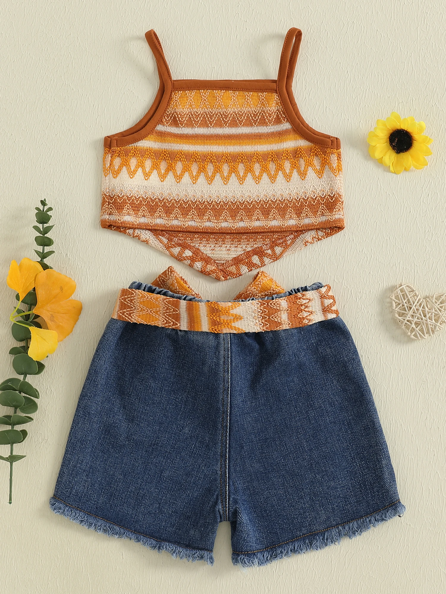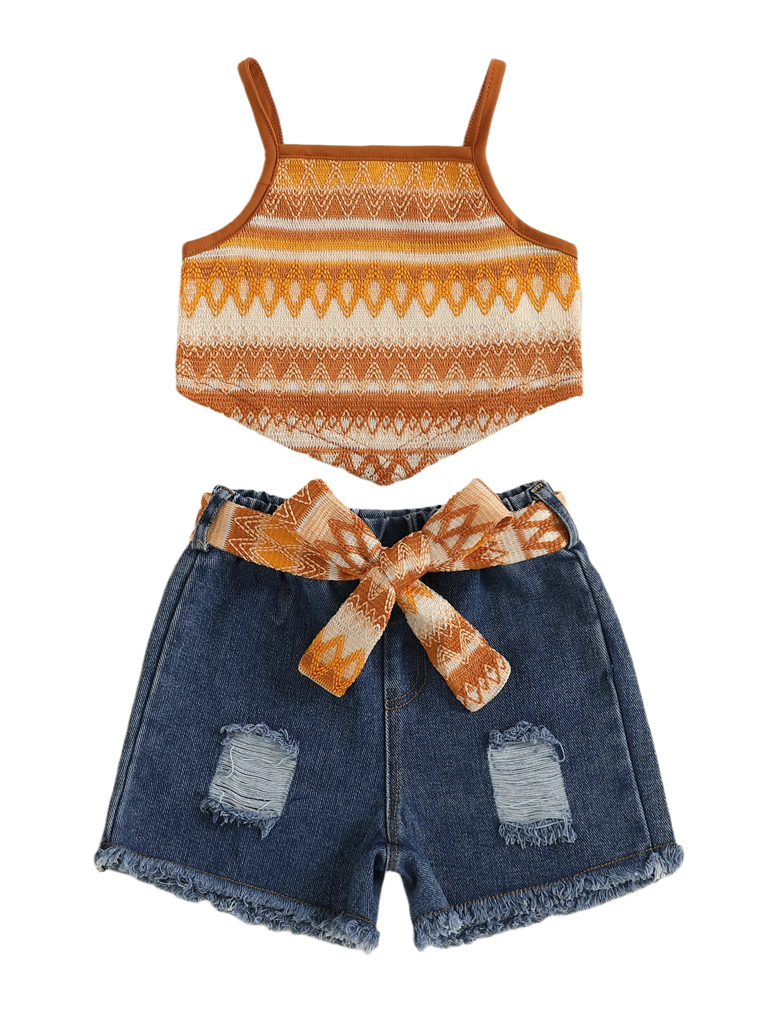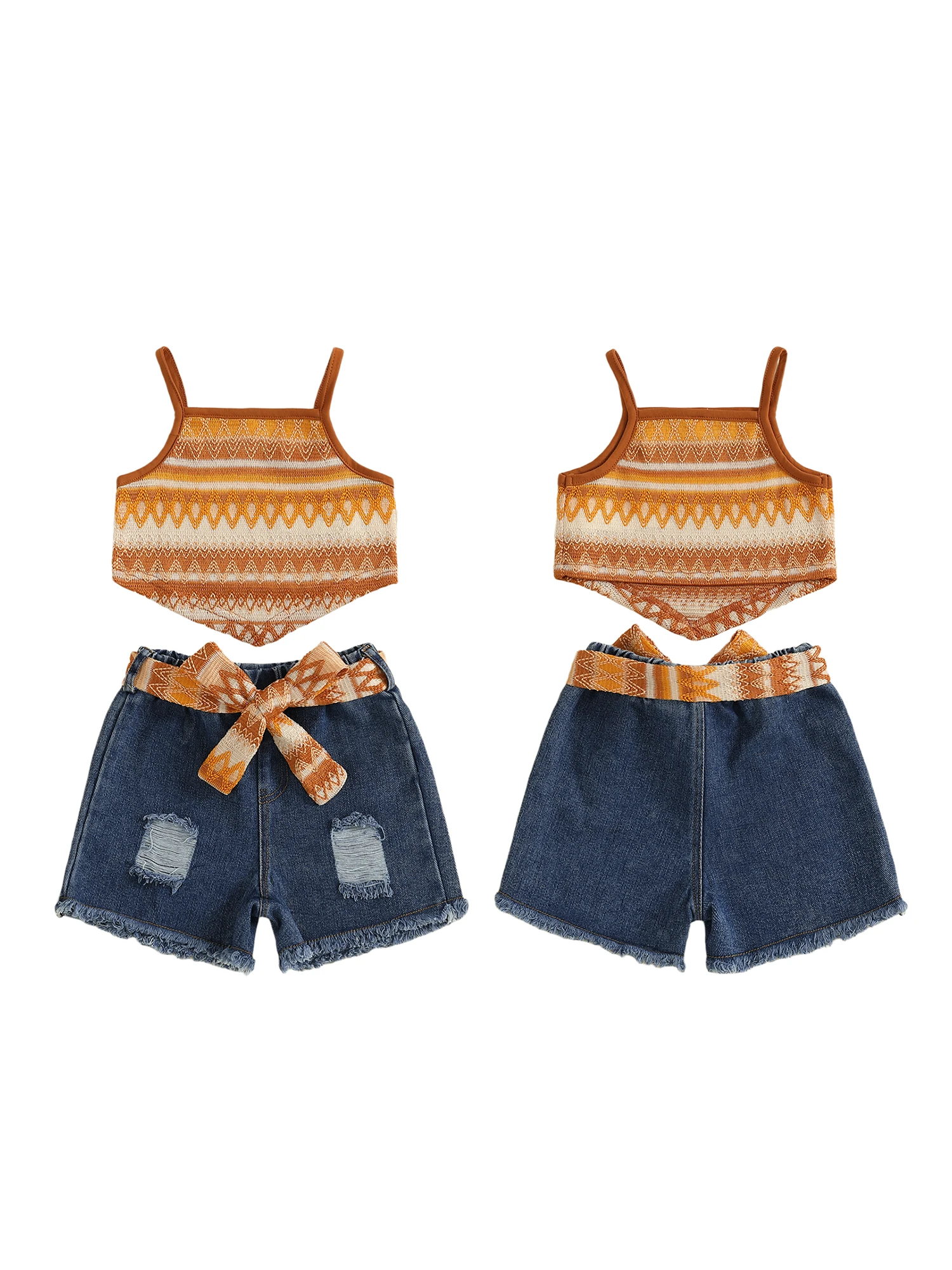 2-7Y Kids Girls Summer Outfits Adorable Boho Print Camisole Tops and Ripped Denim Shorts with Belt Set Fashion Children Clothes