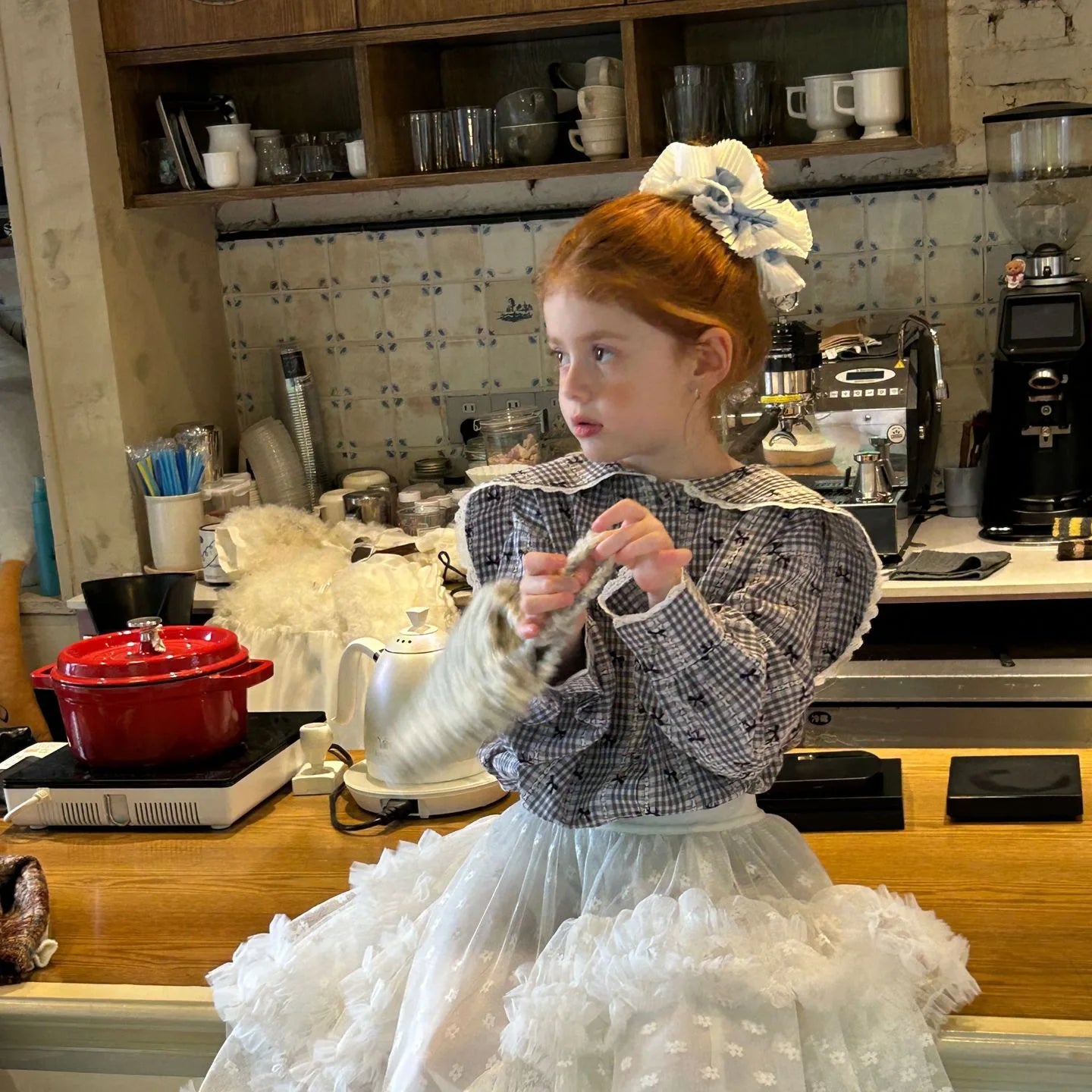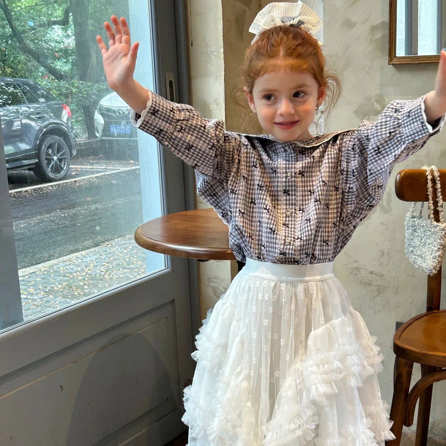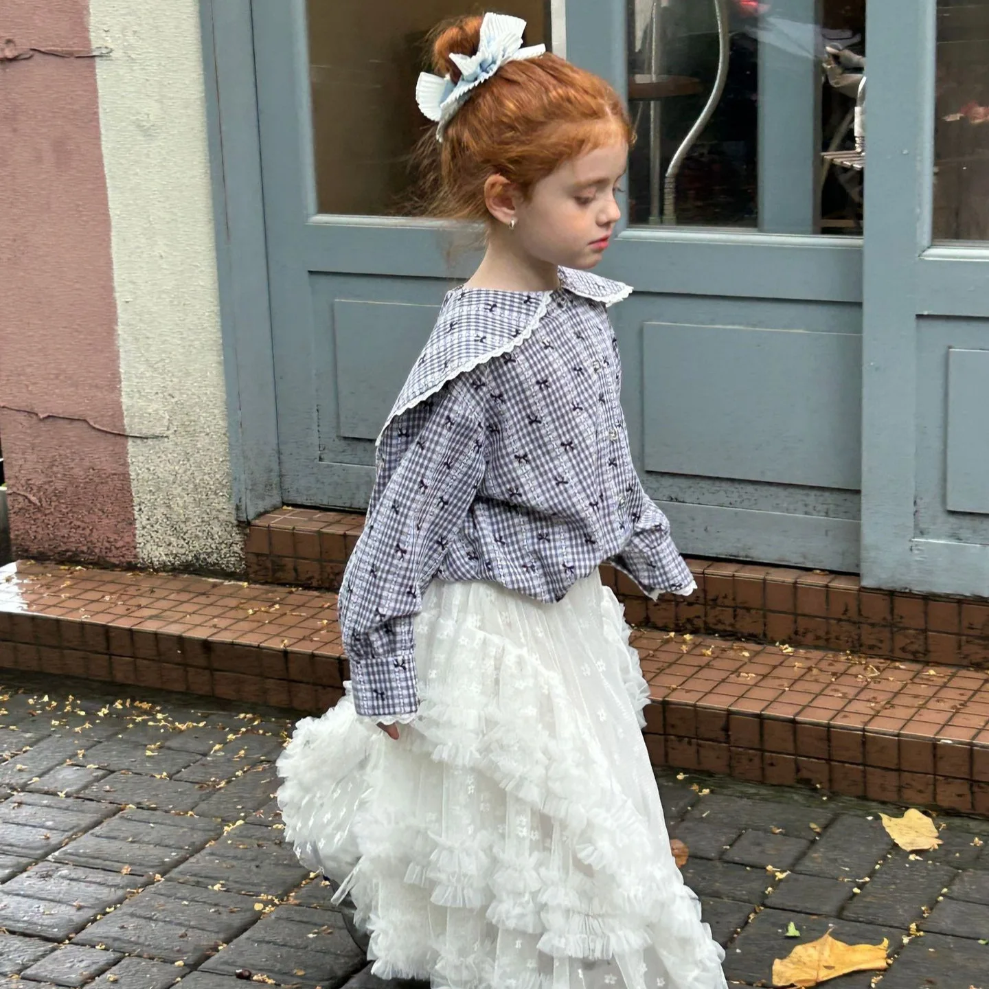 2025 Children's Clothing Girls' Autumn New Fashionable Gentle and Generous Collar Flip Collar Checkered Bow Top