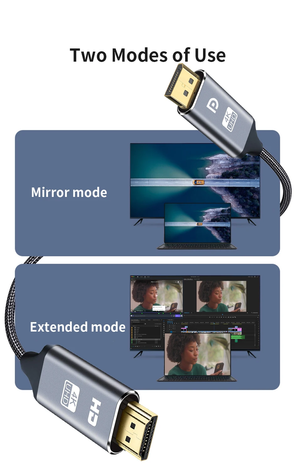 【Strong Anti-interference Capability】 Designed with tinned copper and triple-layer shielding, the DP Cable is enough to transfer high-quality and stable video and audio signals, no worry about visual and audio glitches, artifacts, and audio/video synchronization problems. The aluminum shell, nylon braided cover and gold-plated connectors all ensure the superior durability under the heavy usage and multiple plugging and unplugging(10000+ times bending test).