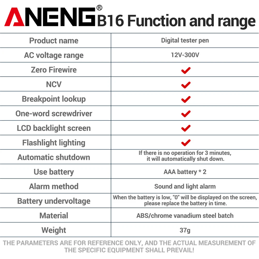 Feature: 1. Superior Craftsmanship: This non-contact voltage detector is expertly crafted with high-quality materials, ensuring durability and precision. The meticulous attention to detail makes it a reliable tool for both professionals and DIY enthusiasts. 2. Clear LCD Display: The NCV voltage tester features a backlit LCD screen that provides clear visibility even in dark environments. Easily read voltage levels and alerts, ensuring you can work safely and effectively in any lighting condition. 3. Compact and Portable: Designed to be lightweight and portable, this electrical pen is easy to carry in your pocket or tool belt. Its thoughtful design ensures you have a reliable voltage test pen at hand whenever you need it. 4. Safe Induction Detection: The smart induction test pen safely detects live wires and circuit continuity, allowing you to identify both neutral and hot wires. This feature enhances safety during electrical work, providing peace of mind. 5. Instant Voltage Alerts: Simply touch the probe to a socket or wire, and if high voltage is detected, the screen will turn red. This quick and intuitive feedback from the voltage test pen ensures you are alerted to potential hazards immediately. Specification: Display Type: Digital Only Note: During the test, the finger must be in full contact with the touch rod. AC voltage measurement must be in contact with the live conductor to obtain an accurate value. If it is in contact with a metal object or the outer skin of a live conductor covered by an electric field, or non-contact in a super strong electric field, although the voltage value can be measured, the value is for reference only and cannot be used as a basis for measurement. Parameters: Neutral live wire: NCV: yes Breakpoint search: yes Slotted screwdriver: yes LCD backlight screen: yes Flashlight lighting: yes AC voltage range: 12V-300V Automatic shutdown: If there is no operation within 3 minutes, it will automatically shut down. Battery used: AAA battery * 2 (not included) Alarm mode: sound and light alarm Low battery prompt: Battery undervoltage When the battery is low, "o" will be displayed on the screen, please replace the battery in time. Material: ABS+chrome vanadium steel batch Product size: about 160.00x28.00x26.50mm Product size: 6.3x1.1x1.04inch