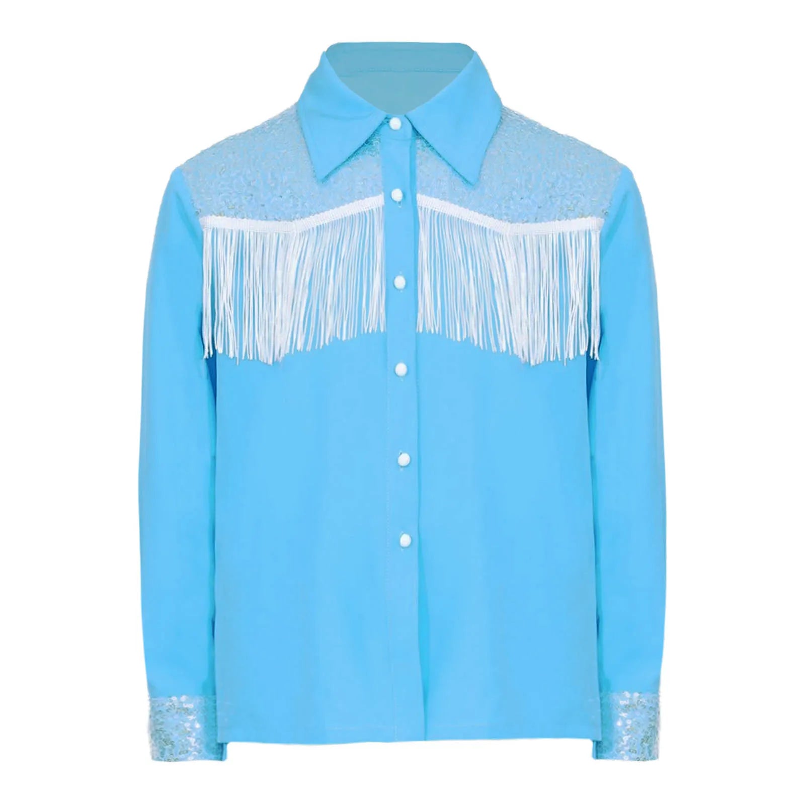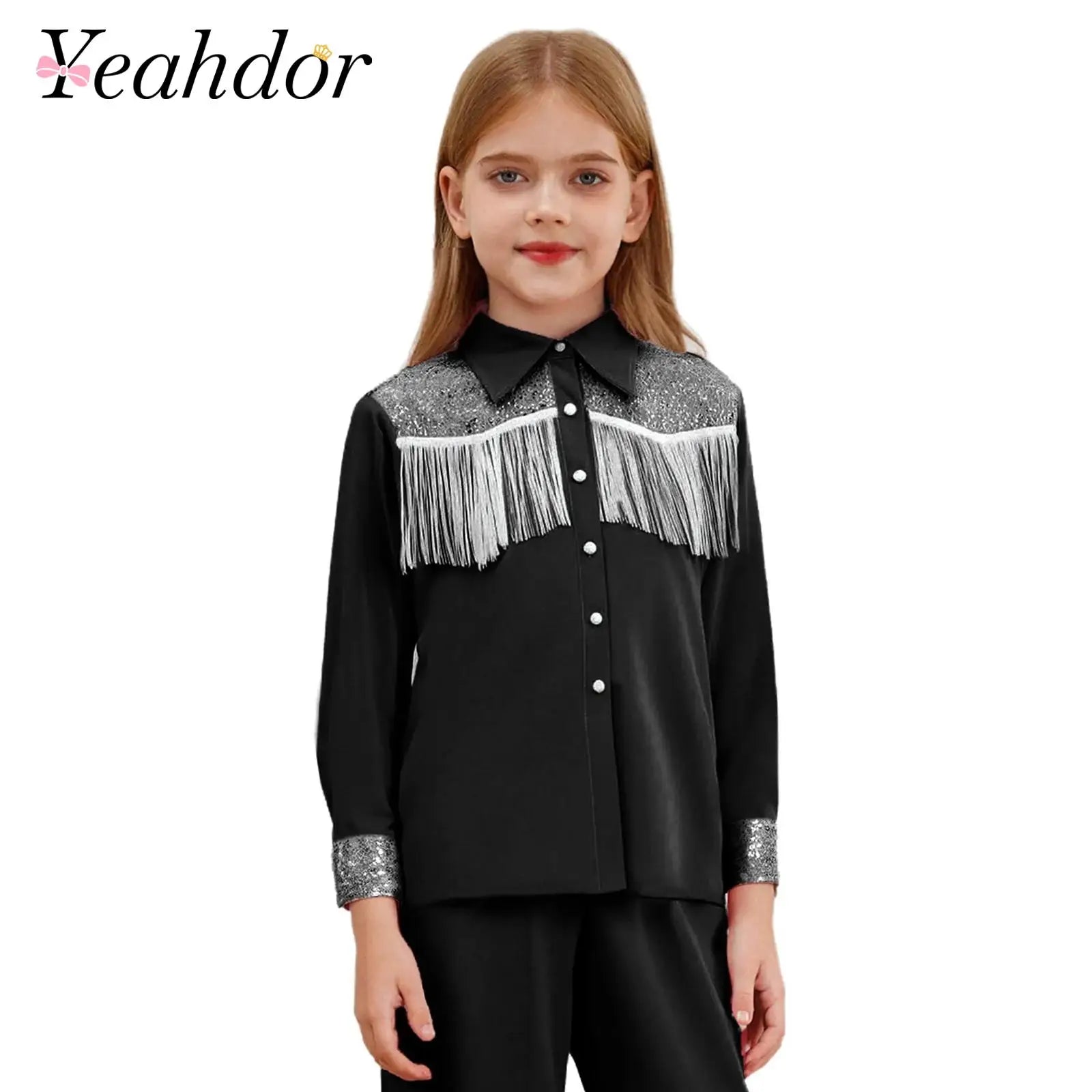 Children Clothes Kid Girls Sequins Fringe Shirt Lapel Long Sleeves Button-down Shirts Western Cowgirl Dress Up Halloween Costume