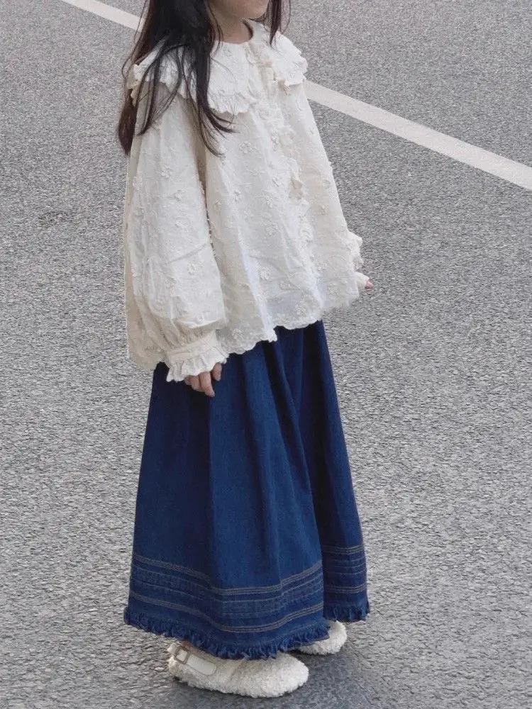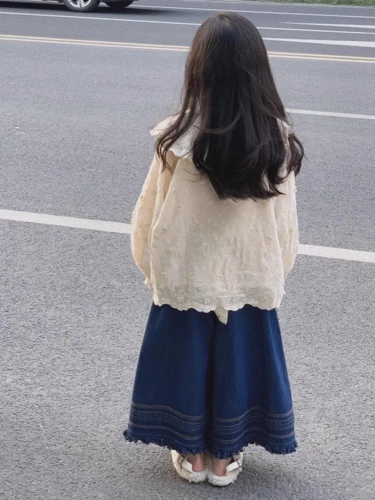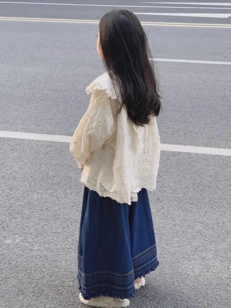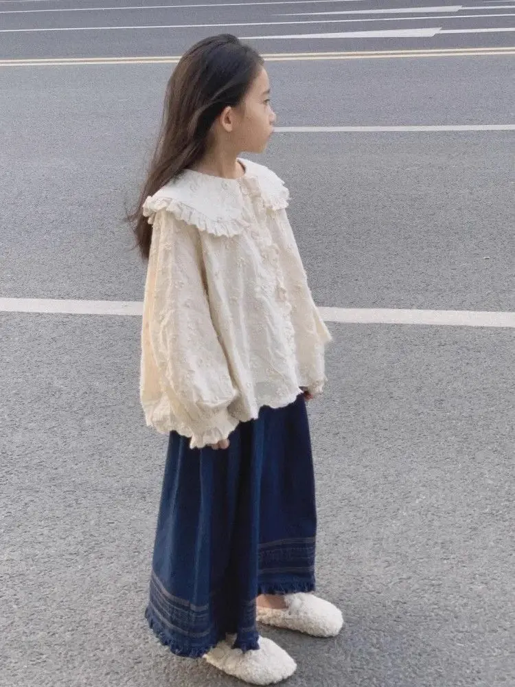 Children's clothing 2025 new spring outfit girls' set children's embroidered doll collar long sleeved shirt denim wide leg pants