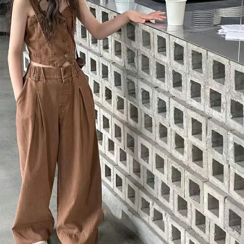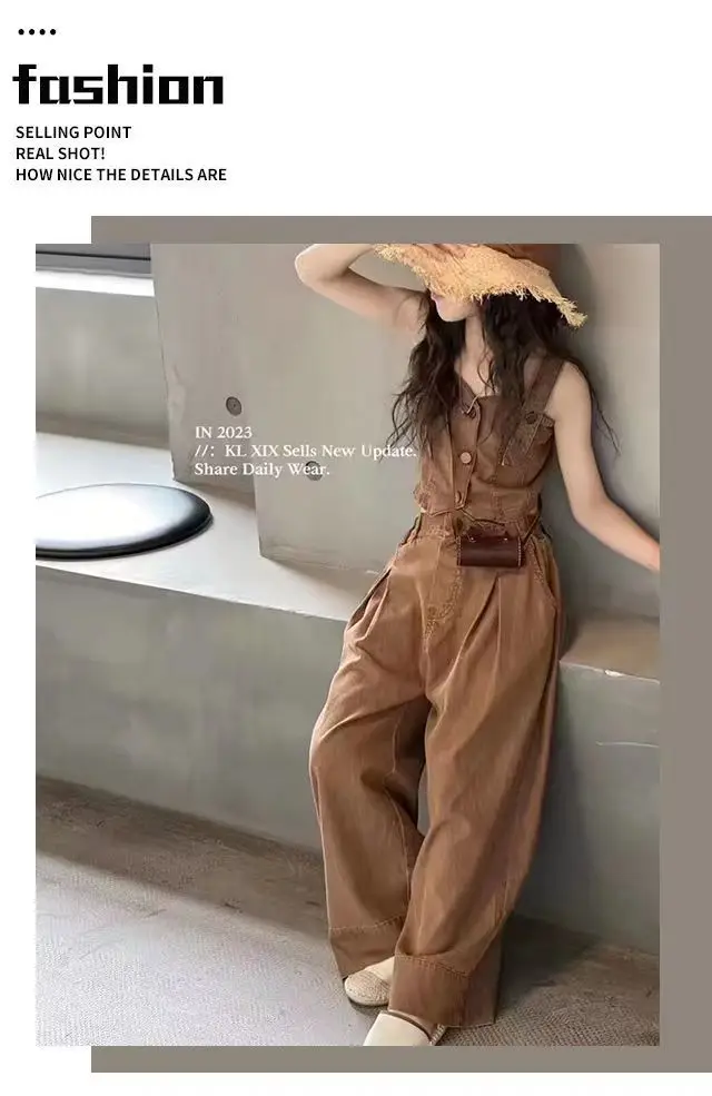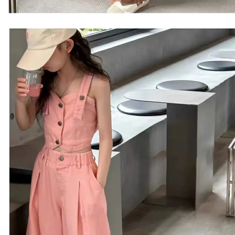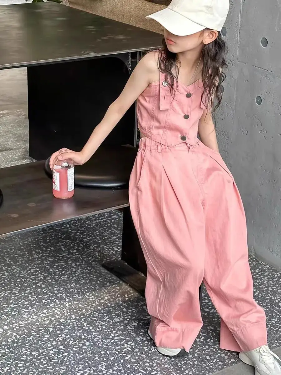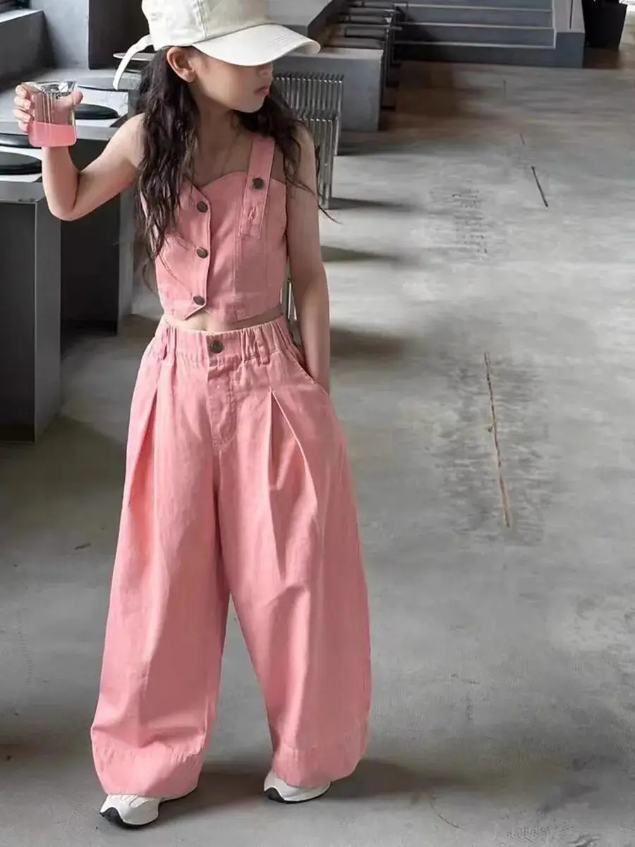 Children's Clothing Girls' Denim Suit Summer Wear Junior Girls Camisole Vest Loose Straight Leg Pants Two Piece Set Korean