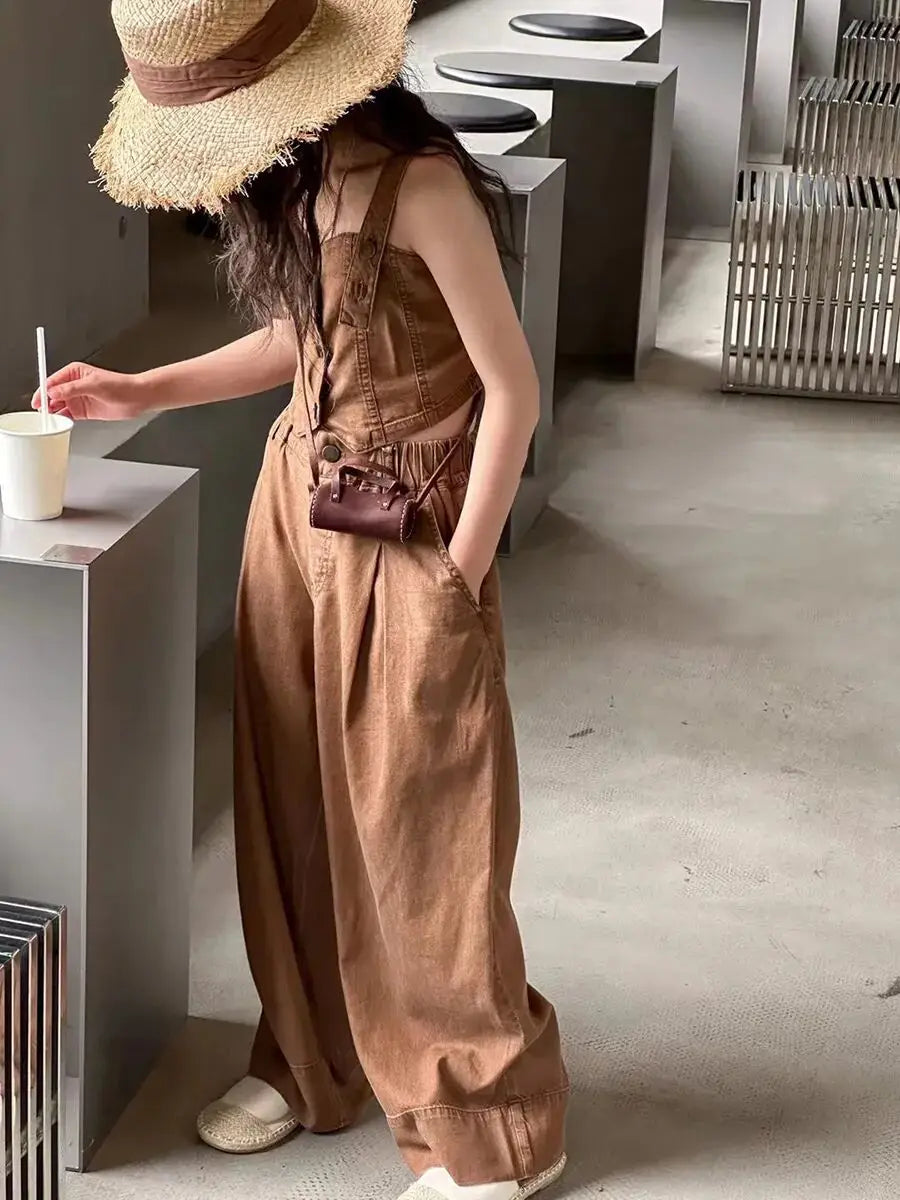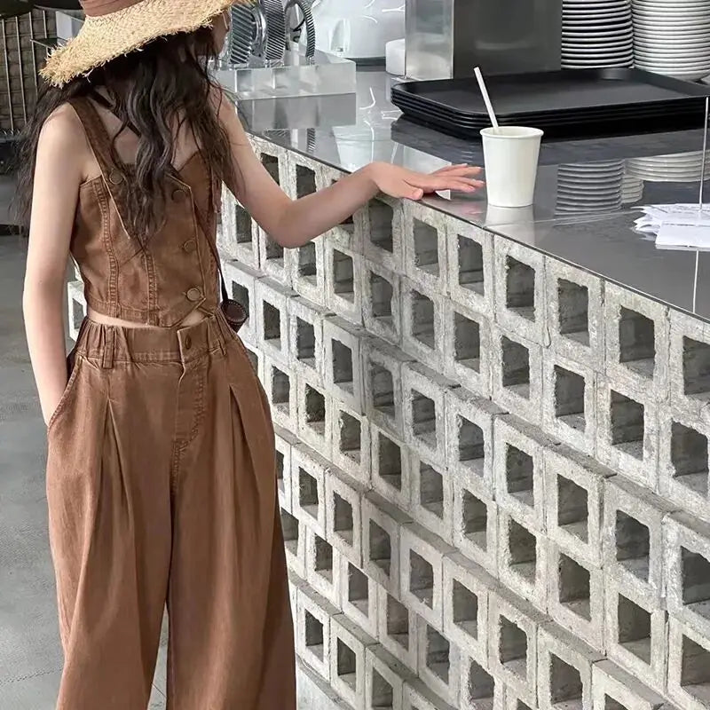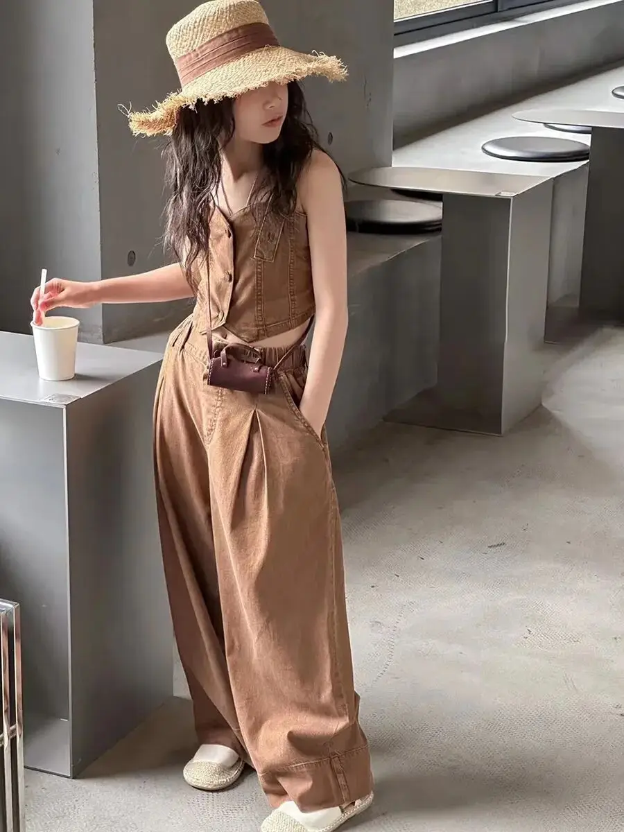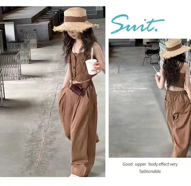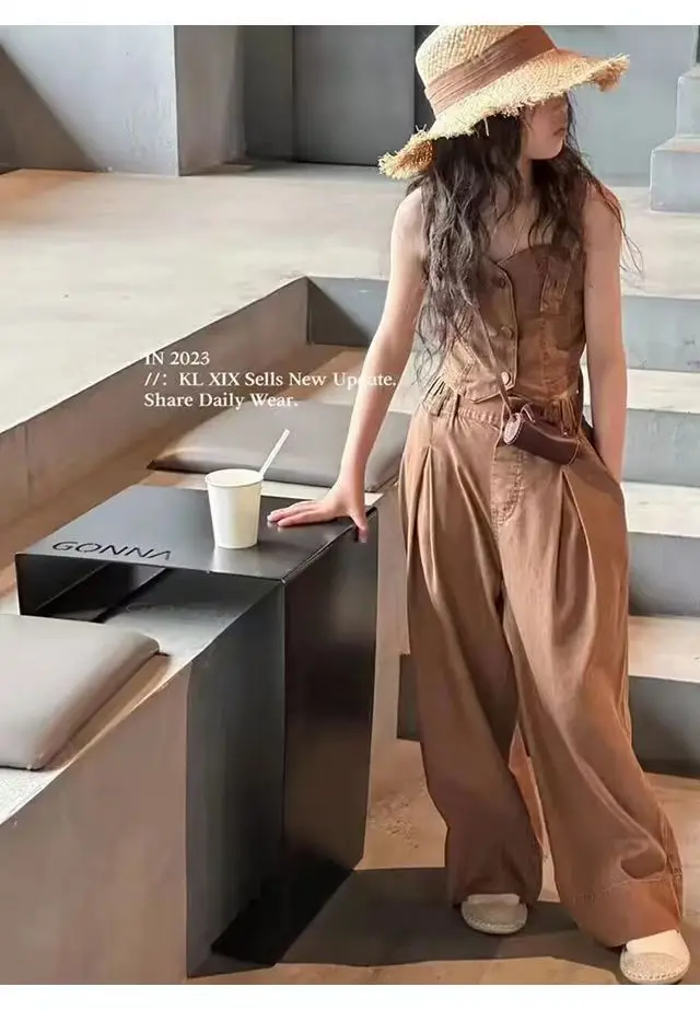 Children's Clothing Girls' Denim Suit Summer Wear Junior Girls Camisole Vest Loose Straight Leg Pants Two Piece Set Korean