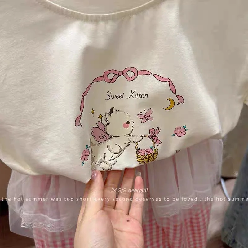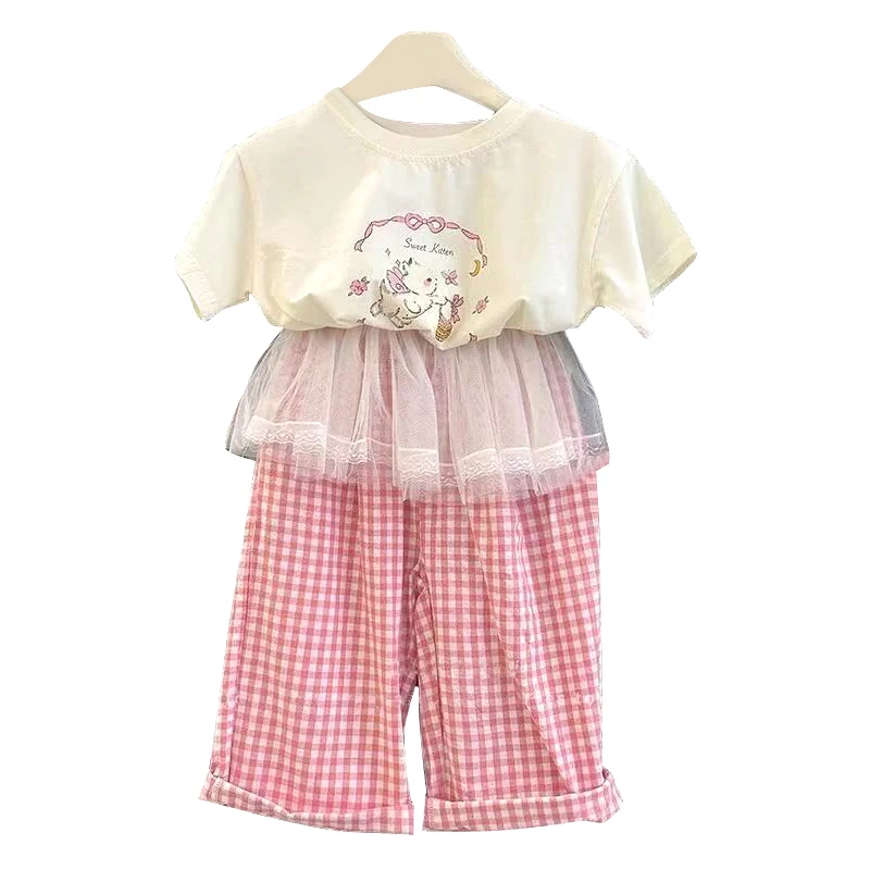 Children's Clothing Sets Girls Cute Suit Kids Short-Sleeved Cartoon Top Lace Trousers 2-Piece Summer New T-Shirt Outfit 2-8 Year