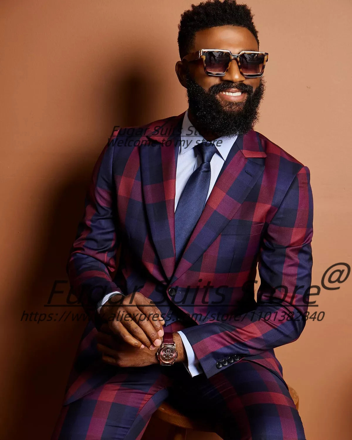 Fashion Plaid Prom Suits For Men Slim Fit Notched Lapel Groom Tuxedos 2 Pieces Sets Male Casual Blazers Handsome Ropa Hombre