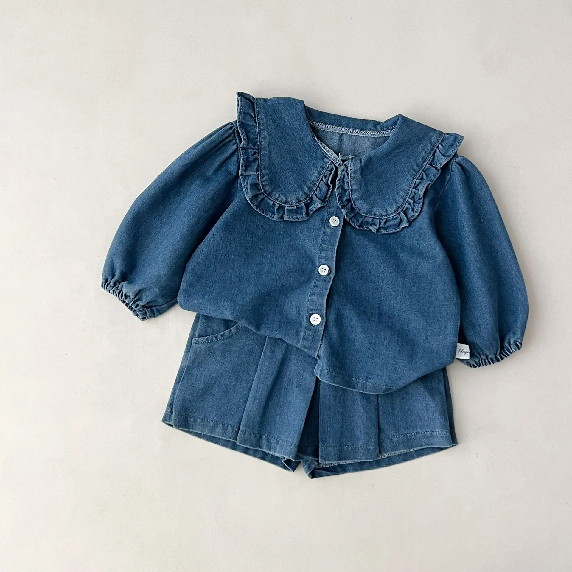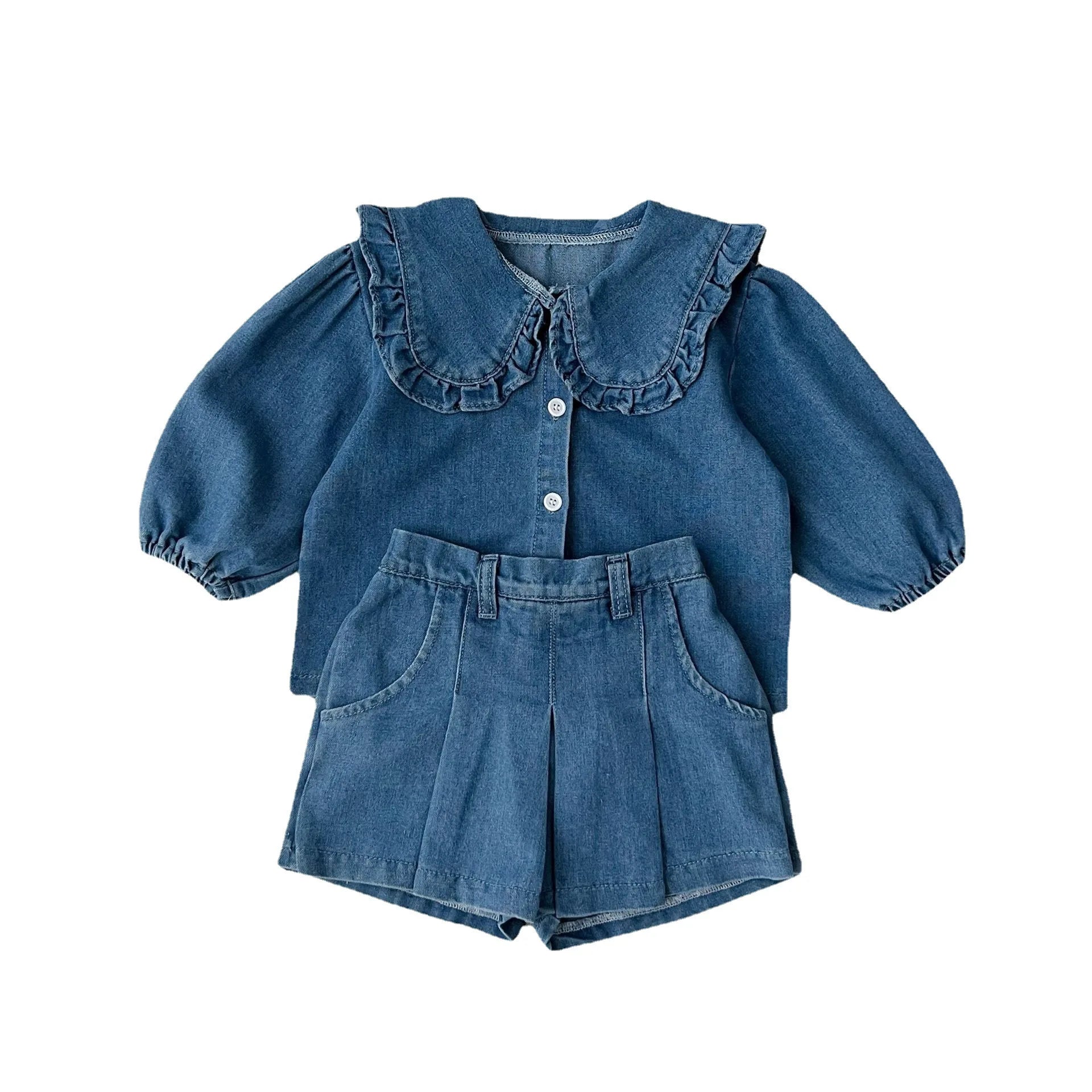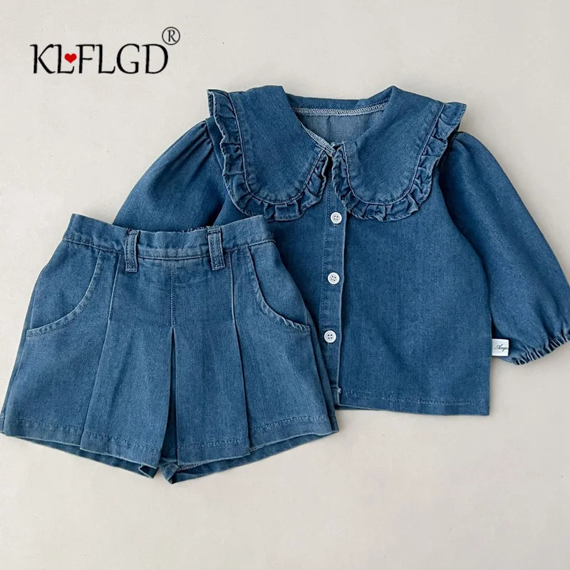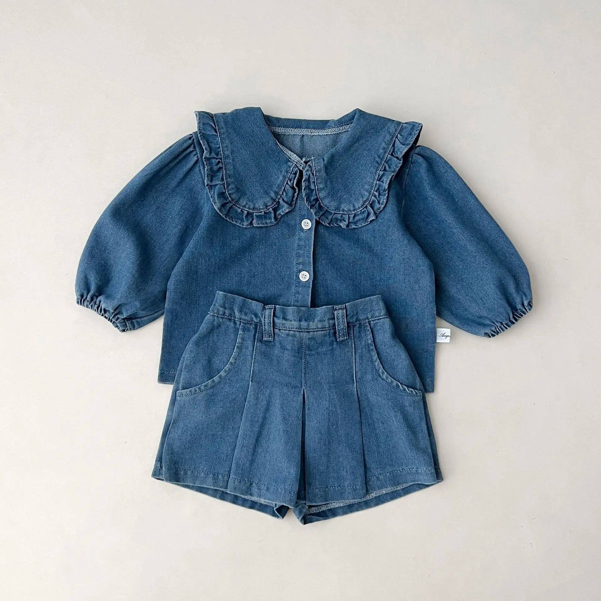 fashionable childrens set denim top+jeans short Korean version girl casual sports two-piece set 0-6 year old childrens cloth