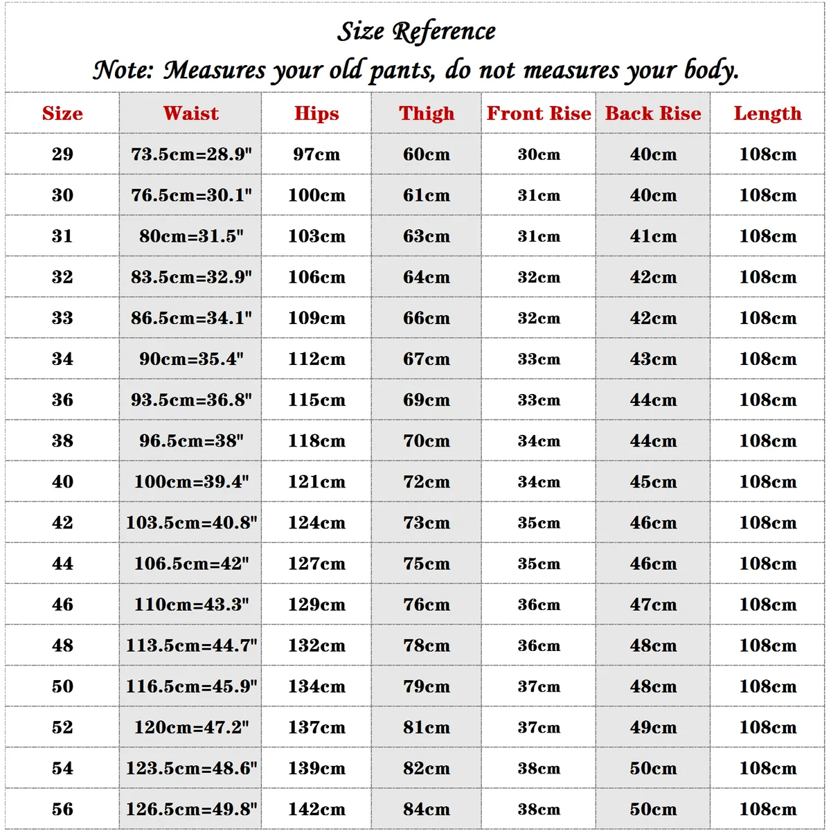 Note: Please measures your old pants, do not measures your body.