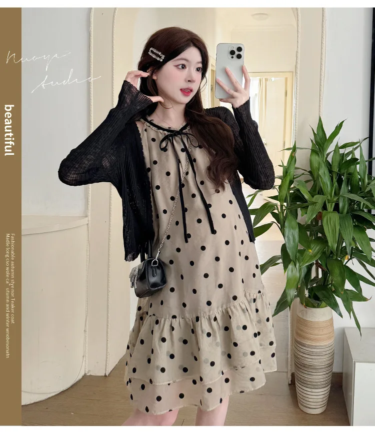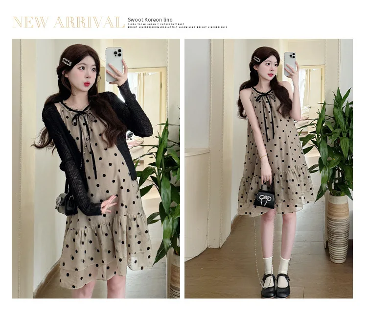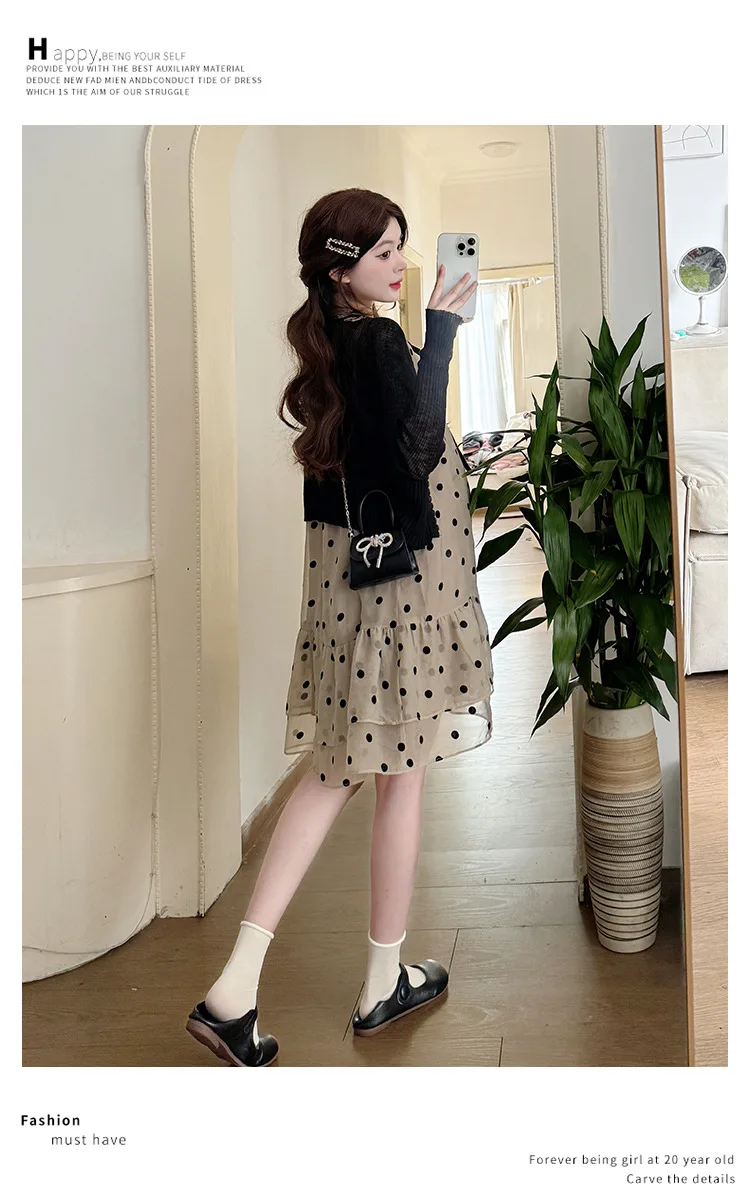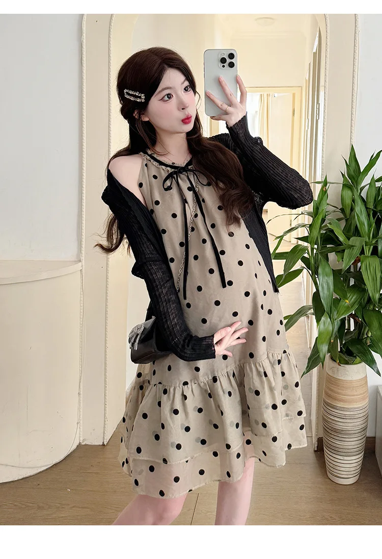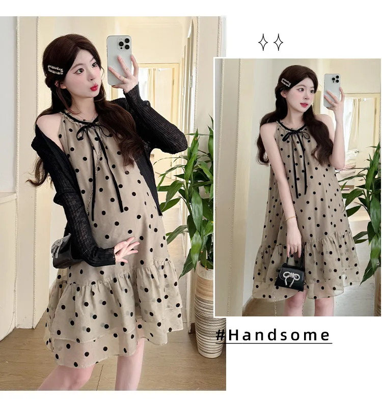 Pregnant Women's Clothing 2025 Summer New Style Reduced Age French Polka Dot Dress Two-piece Set