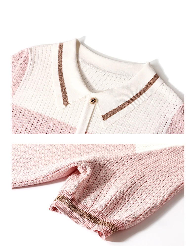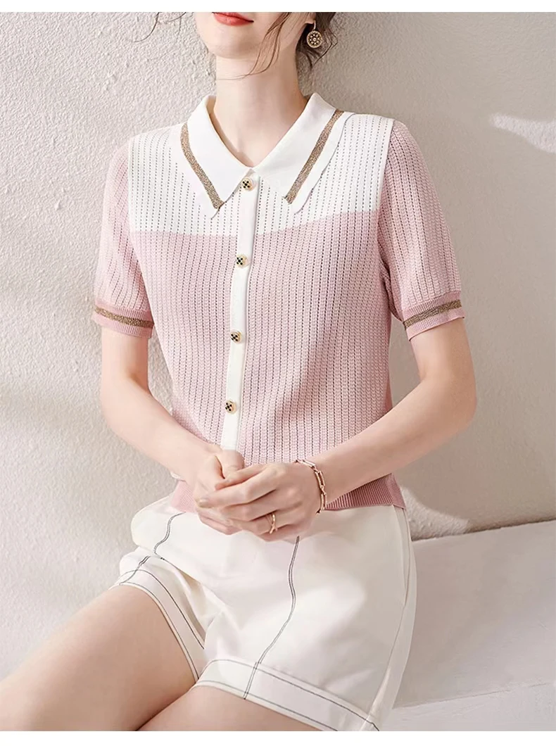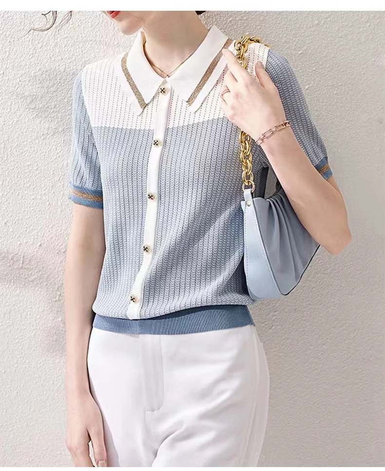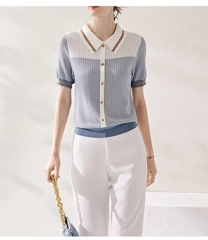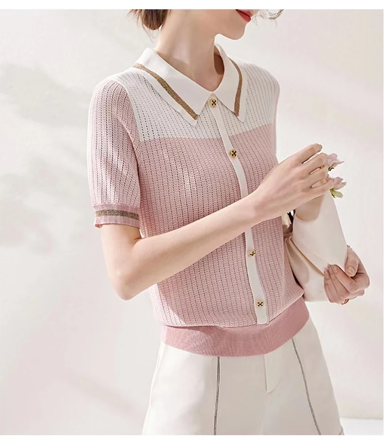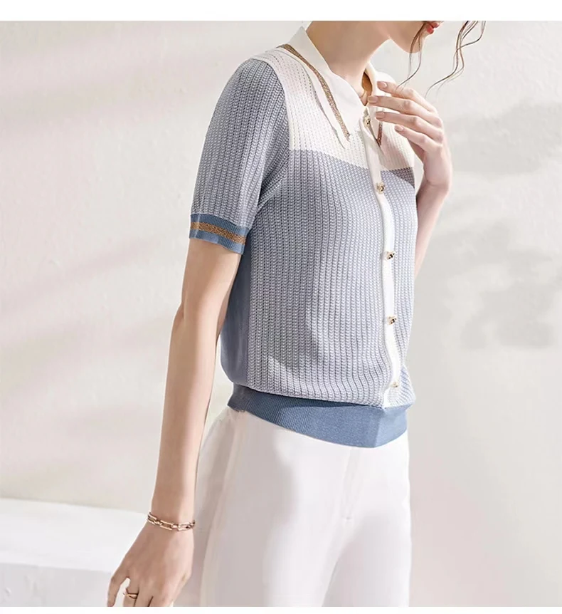 Ropa De Mujer 2024 Summer Casual Tees Patchwork Knitted Tops Women Turn Down Collar Loose T Shirt Female Short Sleeve Tshirts