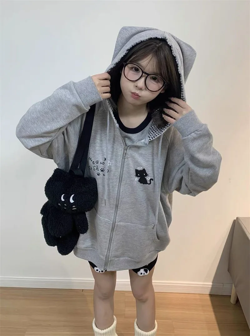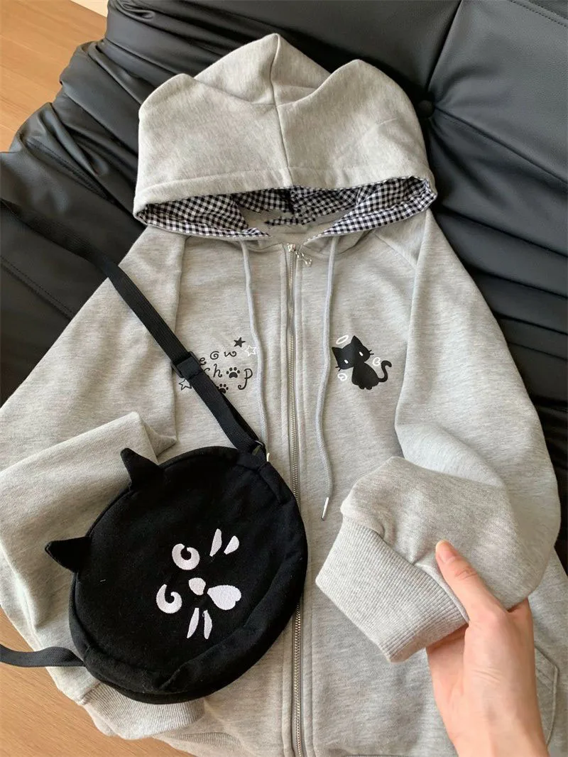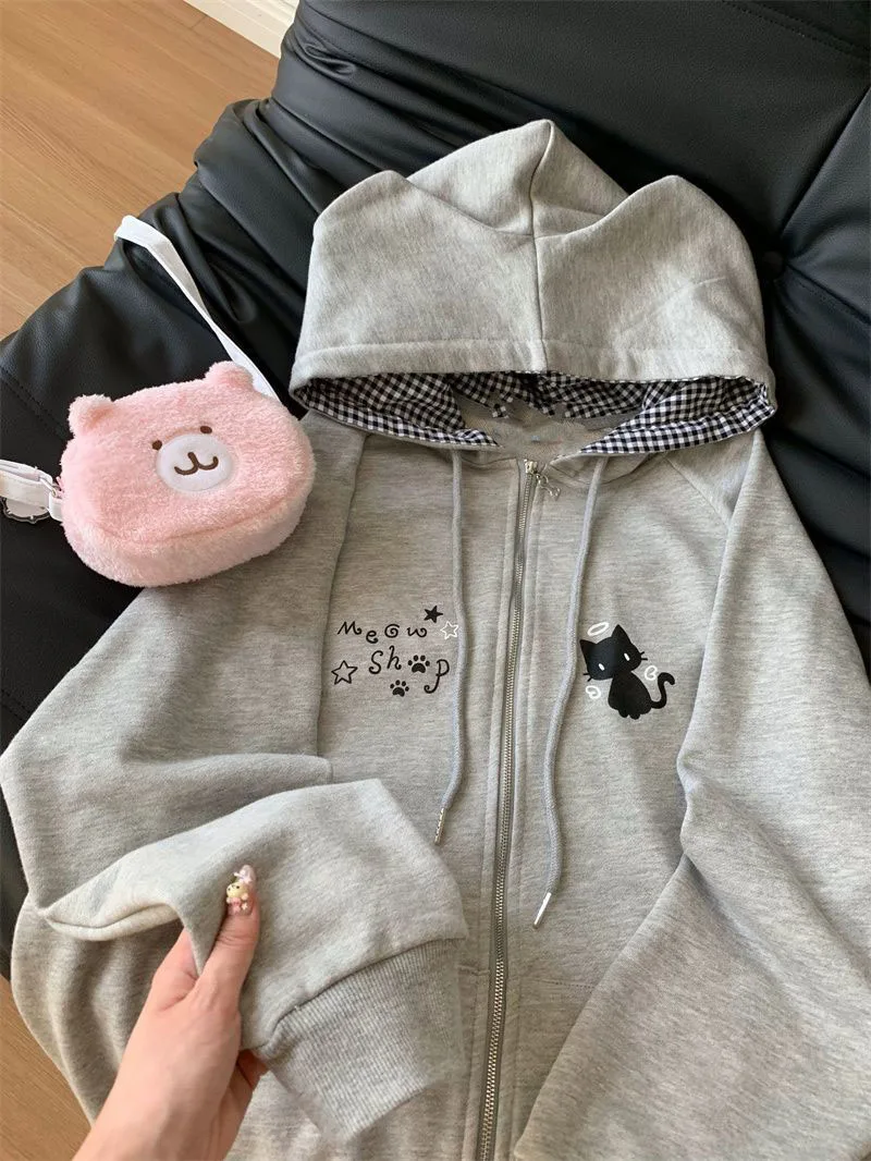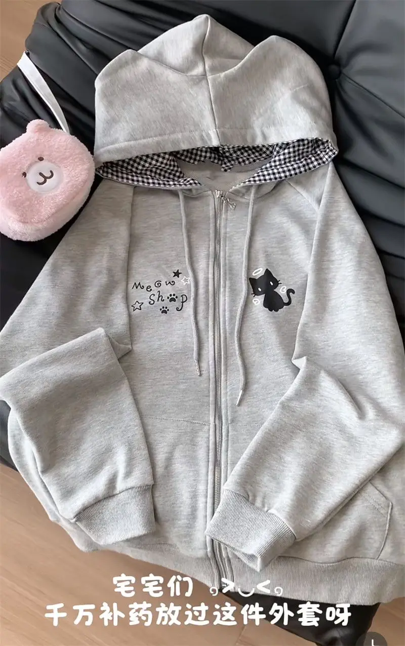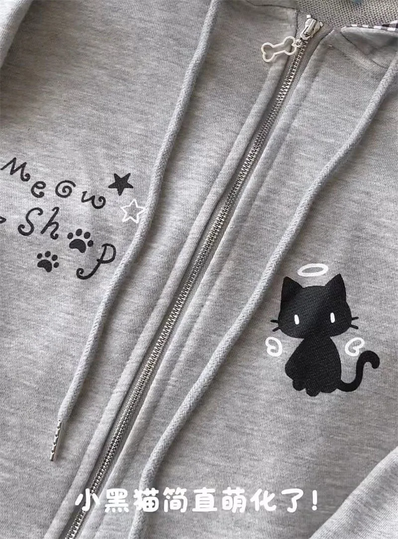 Ropa Mujer Japanese Cute Hoodies Coats Cute Cat Print Hooded Sweatshirts Y2K Tops Women Clothing Casual Zipper Loose Hoodie