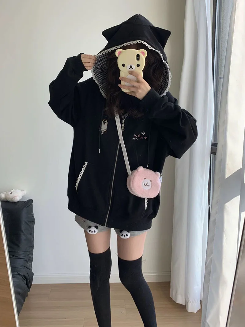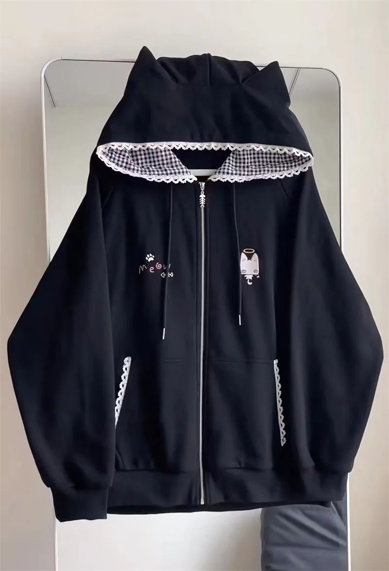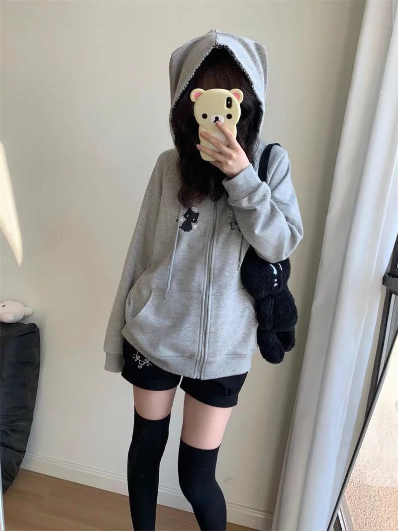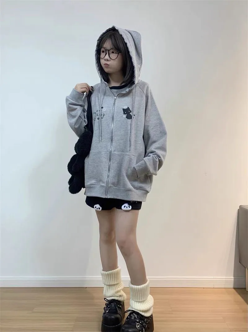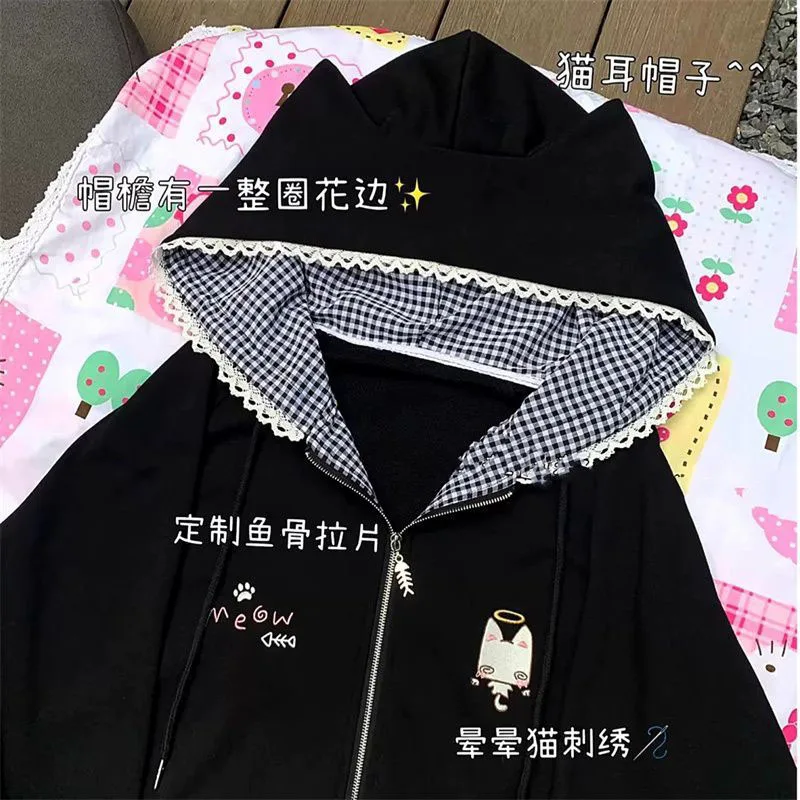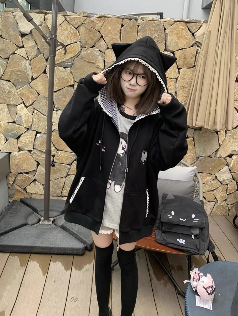 Ropa Mujer Japanese Cute Hoodies Coats Cute Cat Print Hooded Sweatshirts Y2K Tops Women Clothing Casual Zipper Loose Hoodie