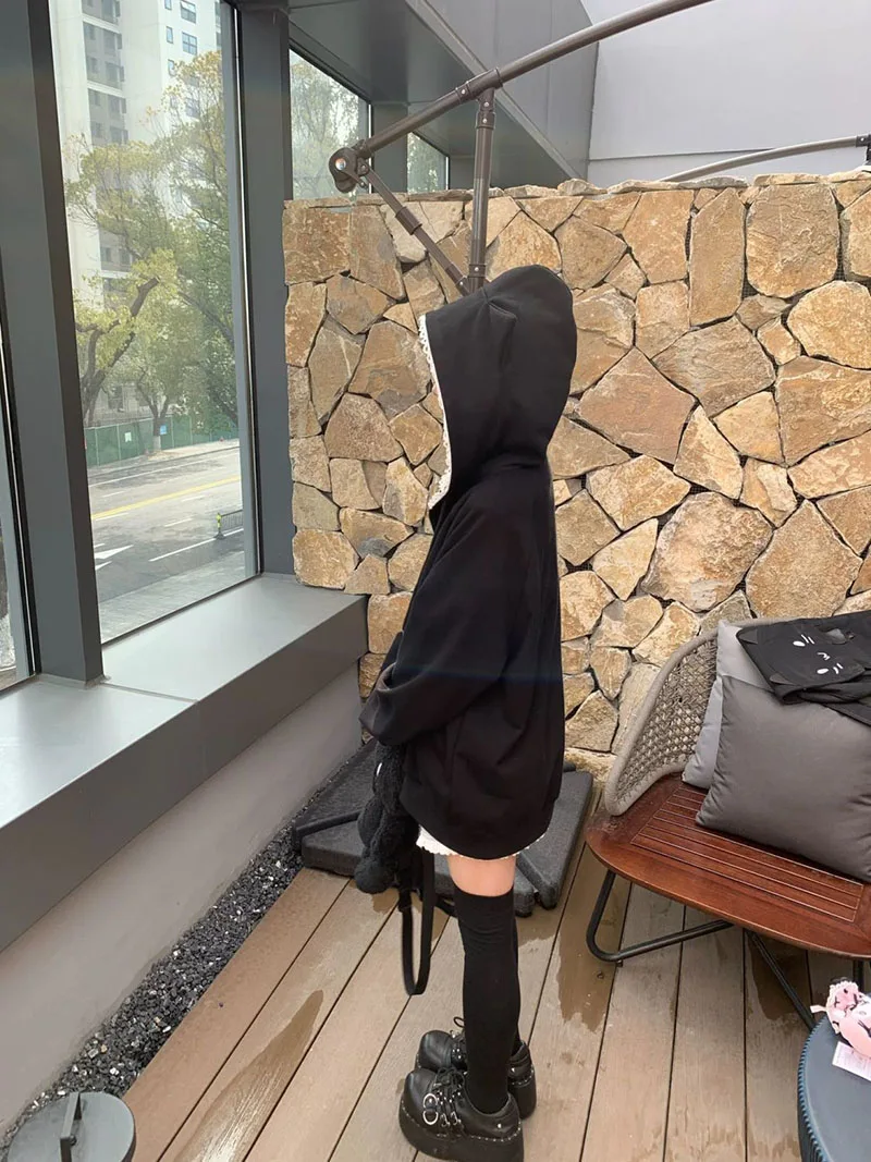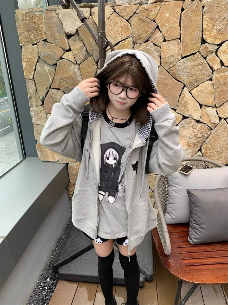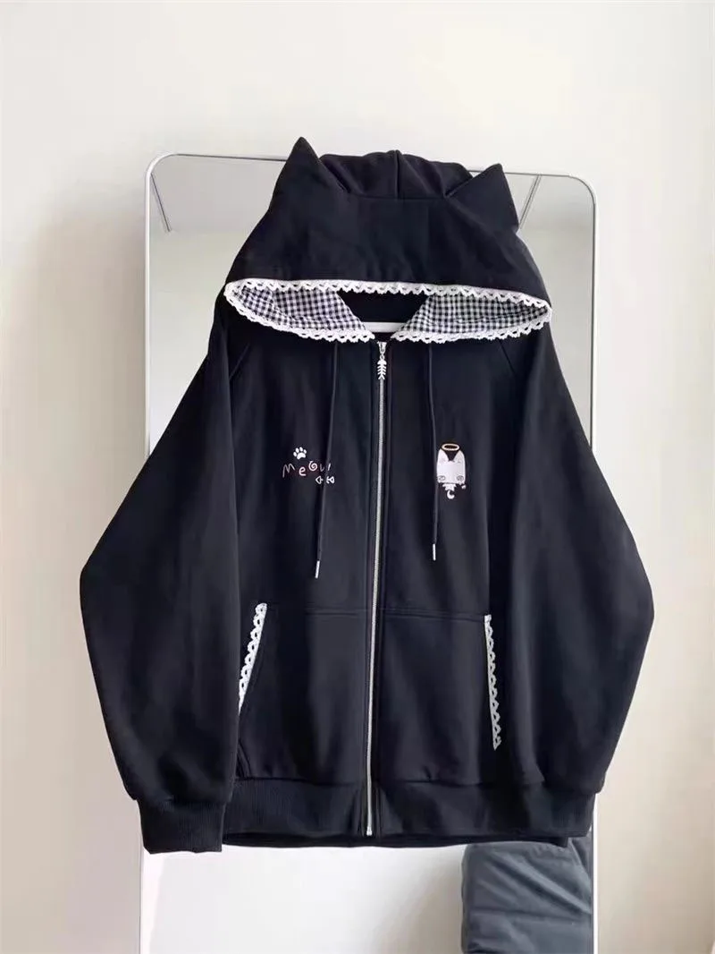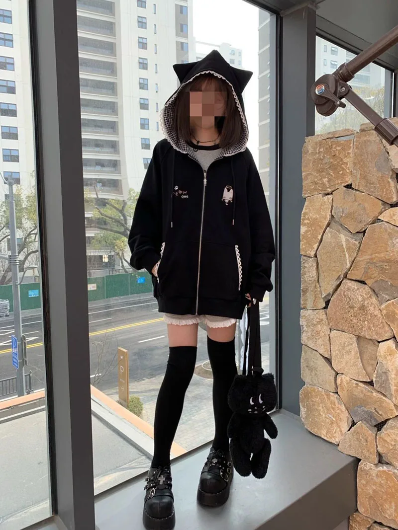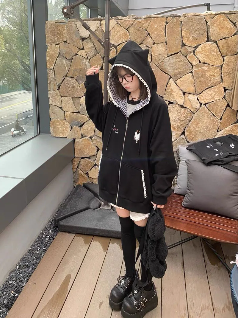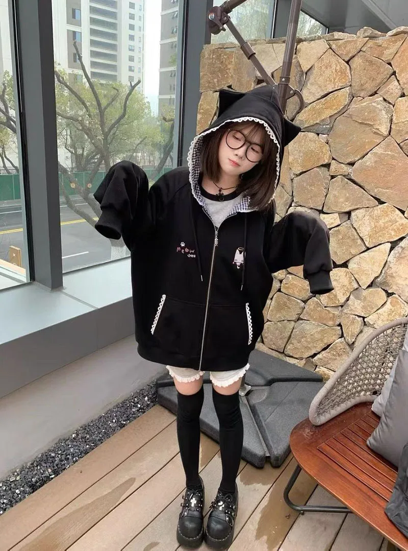 Ropa Mujer Japanese Cute Hoodies Coats Cute Cat Print Hooded Sweatshirts Y2K Tops Women Clothing Casual Zipper Loose Hoodie