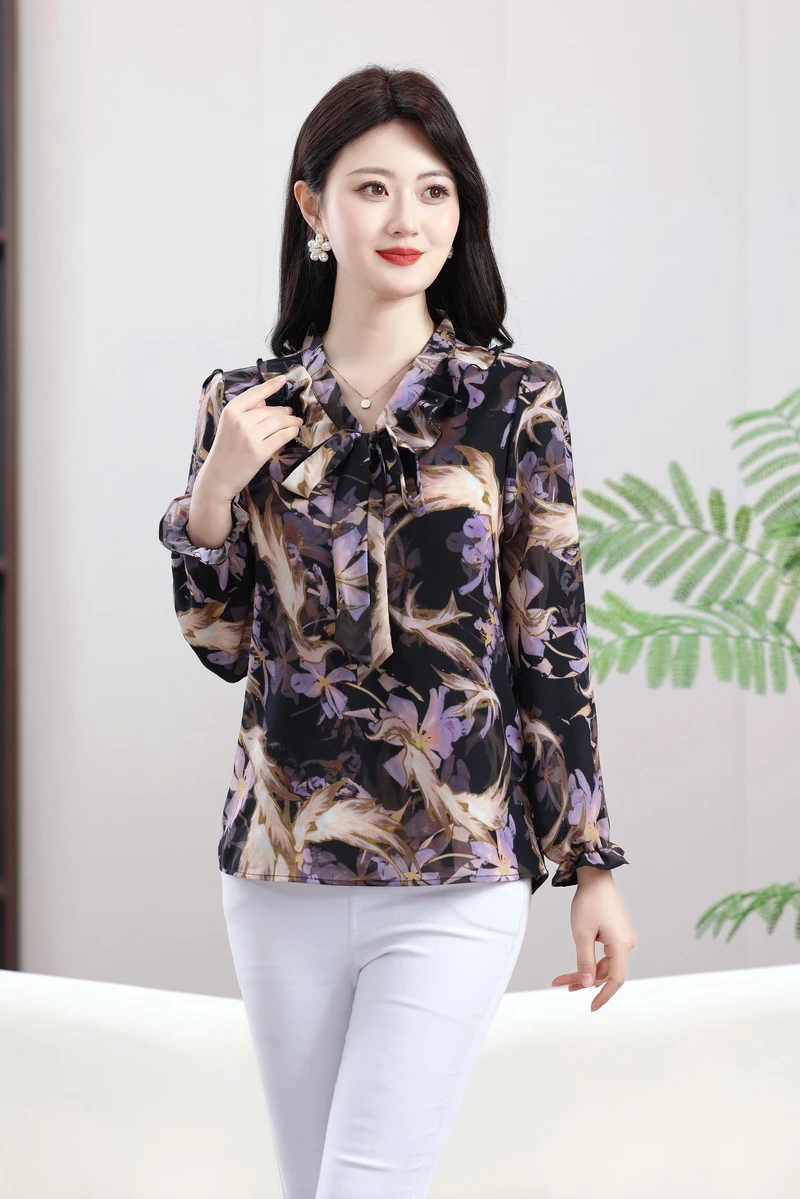 Women Blouse Casual Fashion Bow Ruffles Print Chiffon Blouse Shirt Spring and summer Long Sleeve Women Tops Blusa Mujer