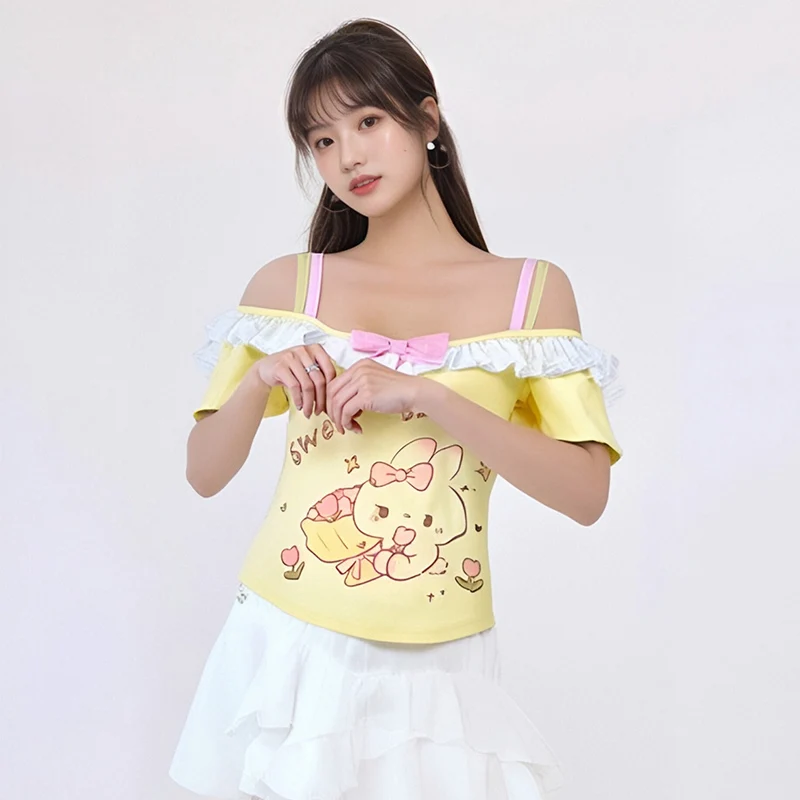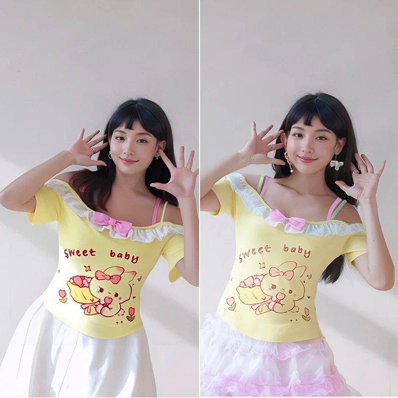 Women clothing T-shirt Y2k Cute Sweet Girls Short Sleeves Crop Top Harajuku Women Lolita Kawaii Cartoon Print ropa de mujer