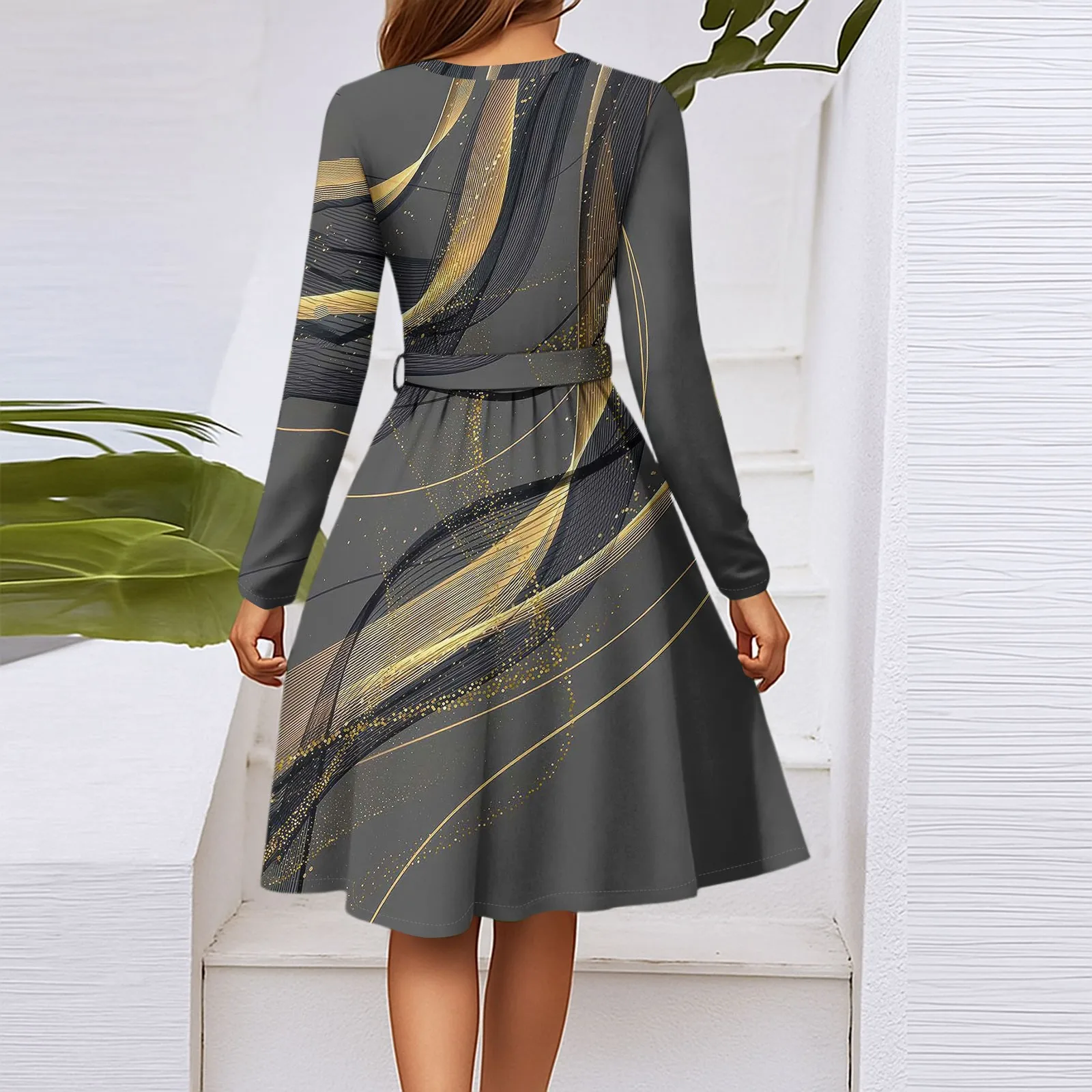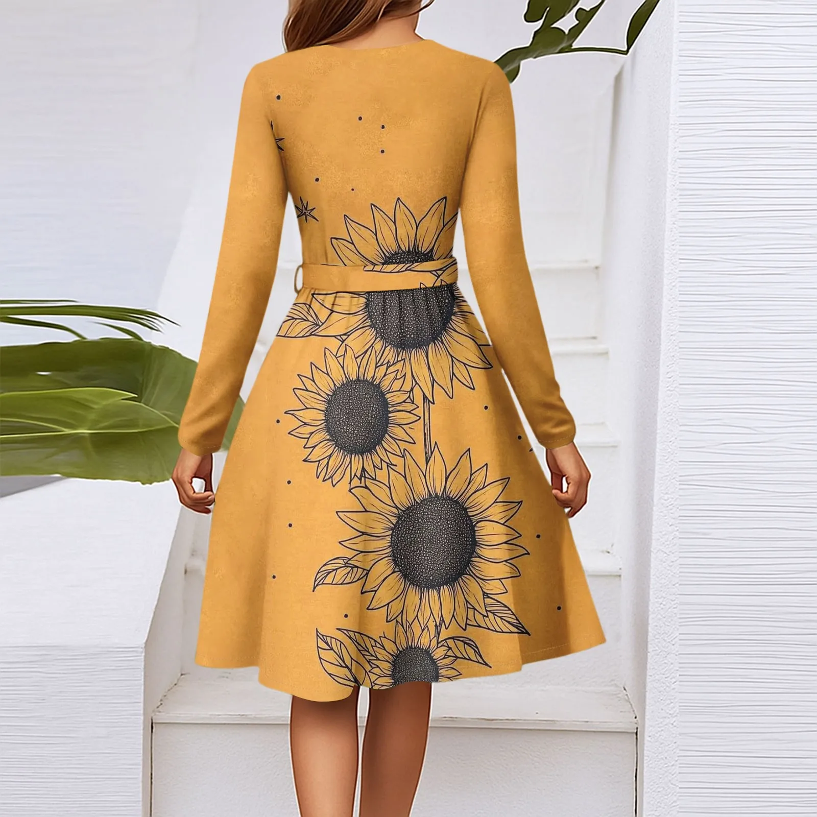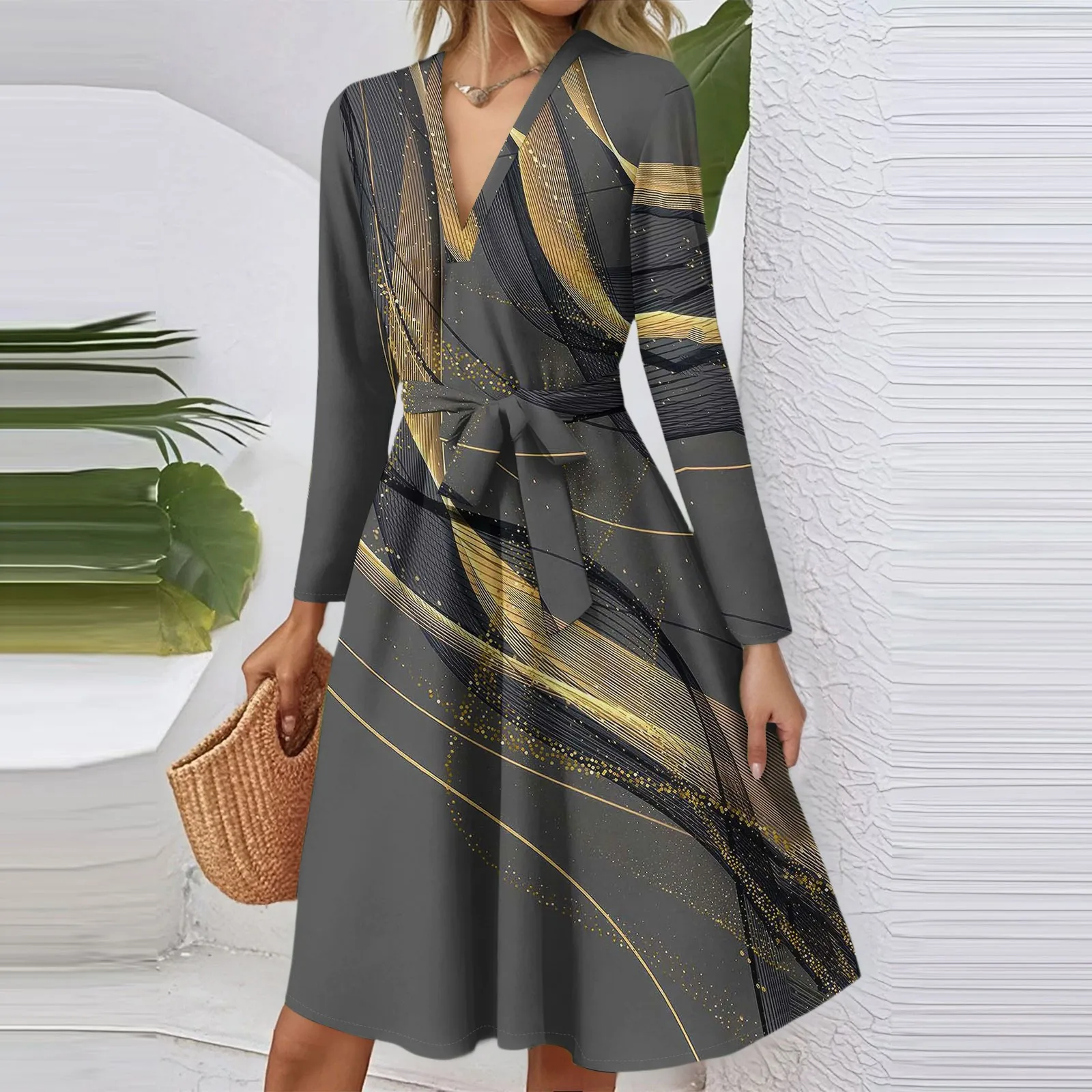 Women'S Fashion Casual V-Neck Long Sleeve Waist Floral Print Midi Dress Vestidos Para Mujer Female Dress Y2k Traf Roupas Feminin